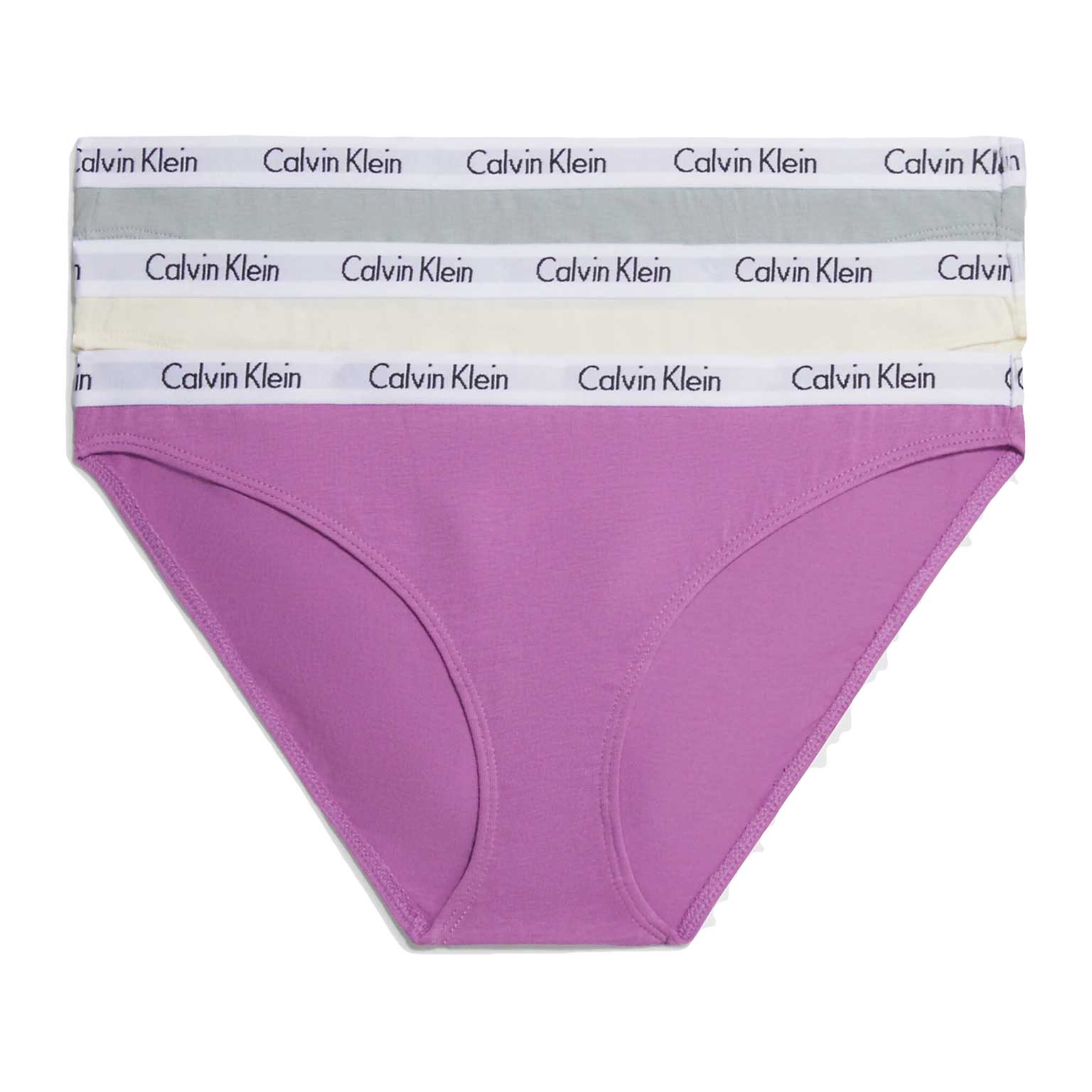 3 komfortable dameslips fra Calvin Klein i en multipakke, lavet af blød, åndbar strækbomuld i lilla, hvid og melangegrå, for variation, med Calvin Klein-logoet på det elastiske taljebånd.