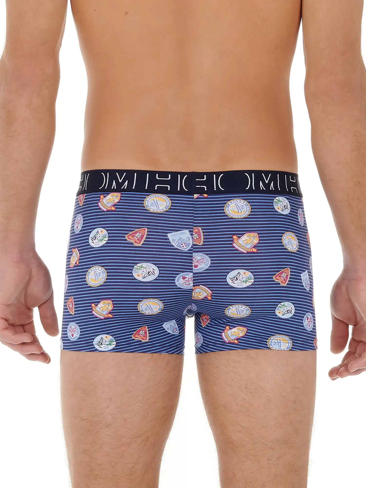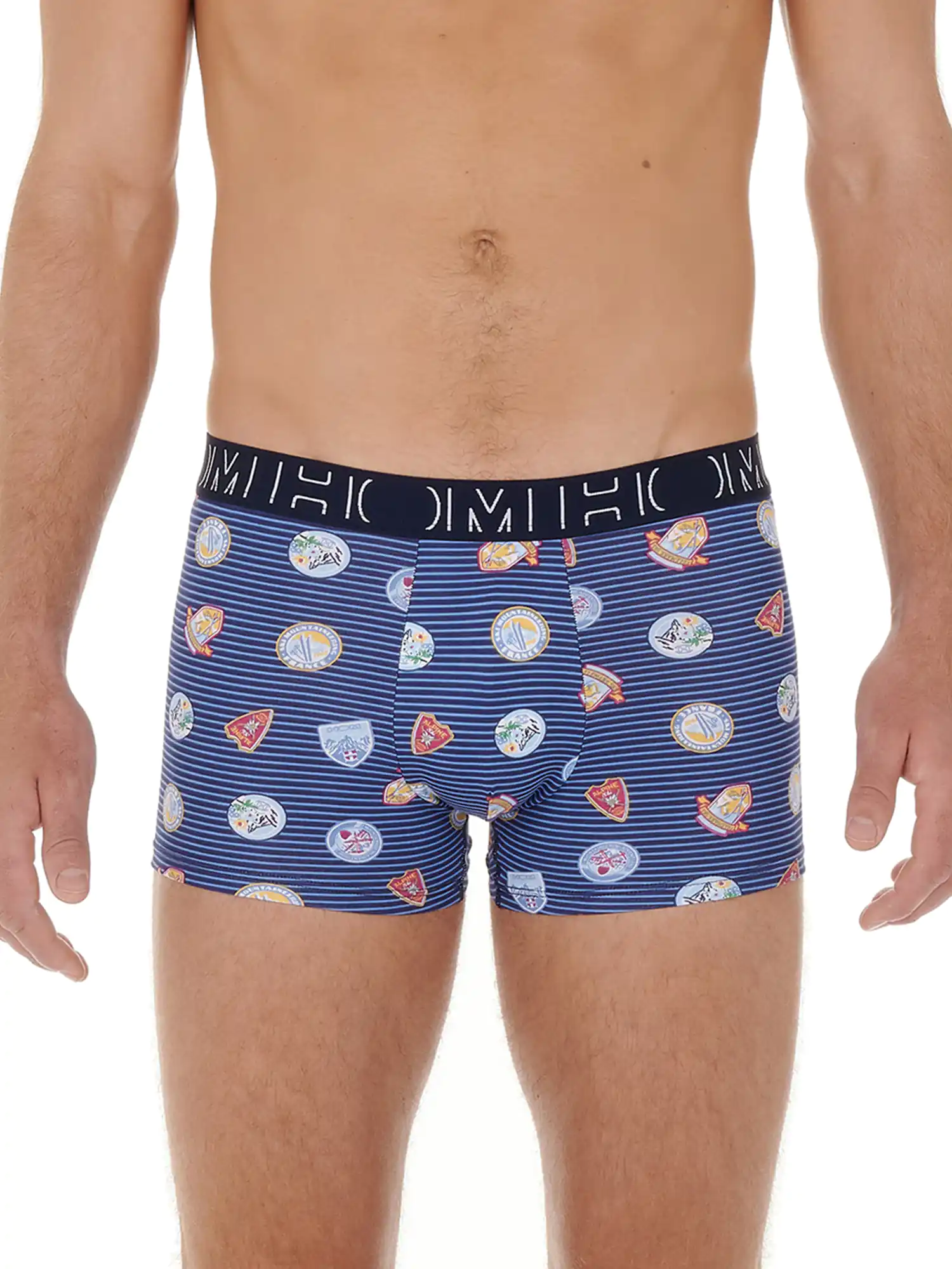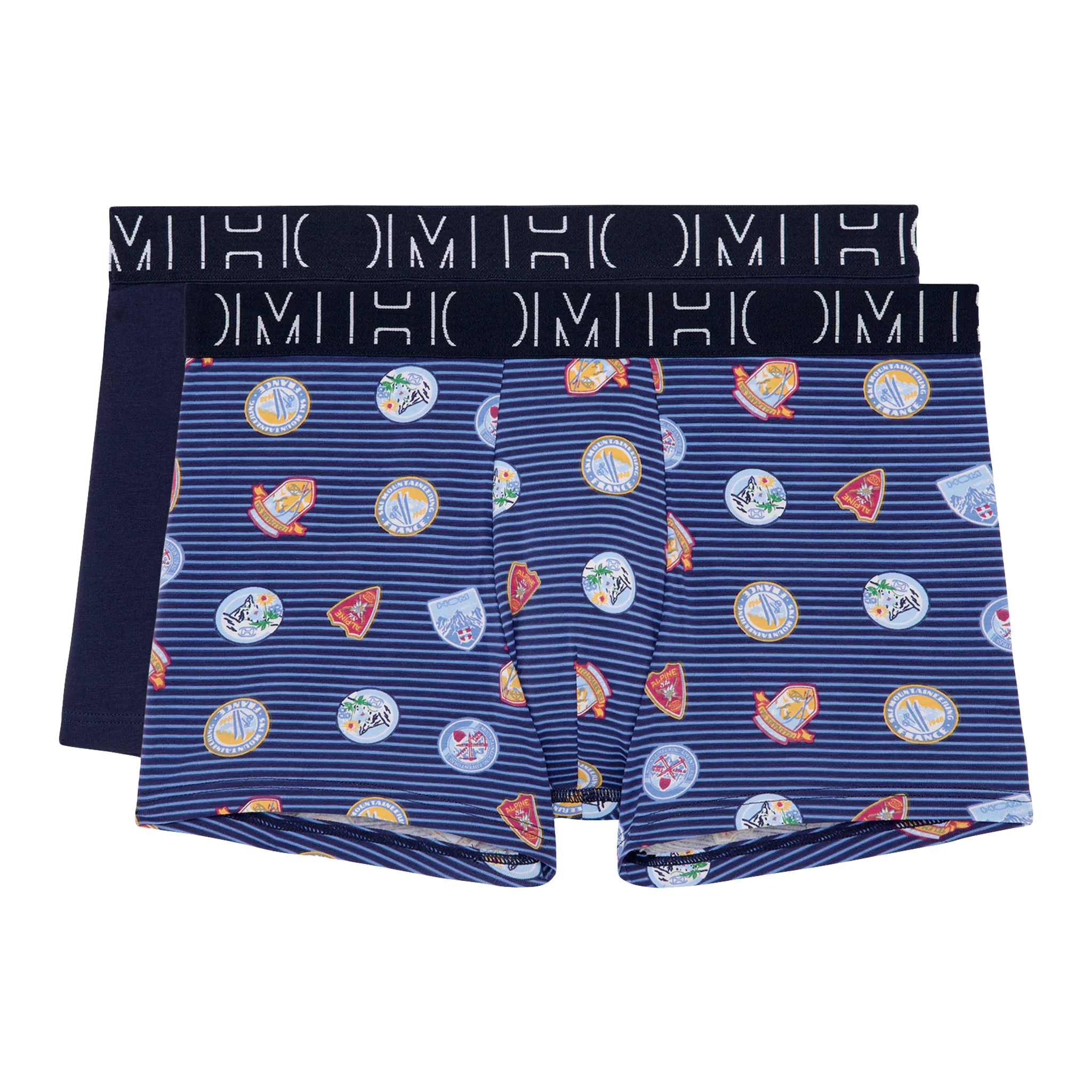 2p Boxer Briefs - Alf er en overkommelig 2-pak. Boxerne er en del af HOM BOXERLINES-serien og er lavet af kæmmet strækbomuld. Disse herreboxere er velegnede til daglig brug og har en pung foran for ekstra støtte og komfort. BOXERLINES-serien er lavet af en lettere kvalitet bomuld end enkeltpakkerne. Alf inkluderer en boxer i ensfarvet marineblå og en boxer med et print med vintersports-emblemer.