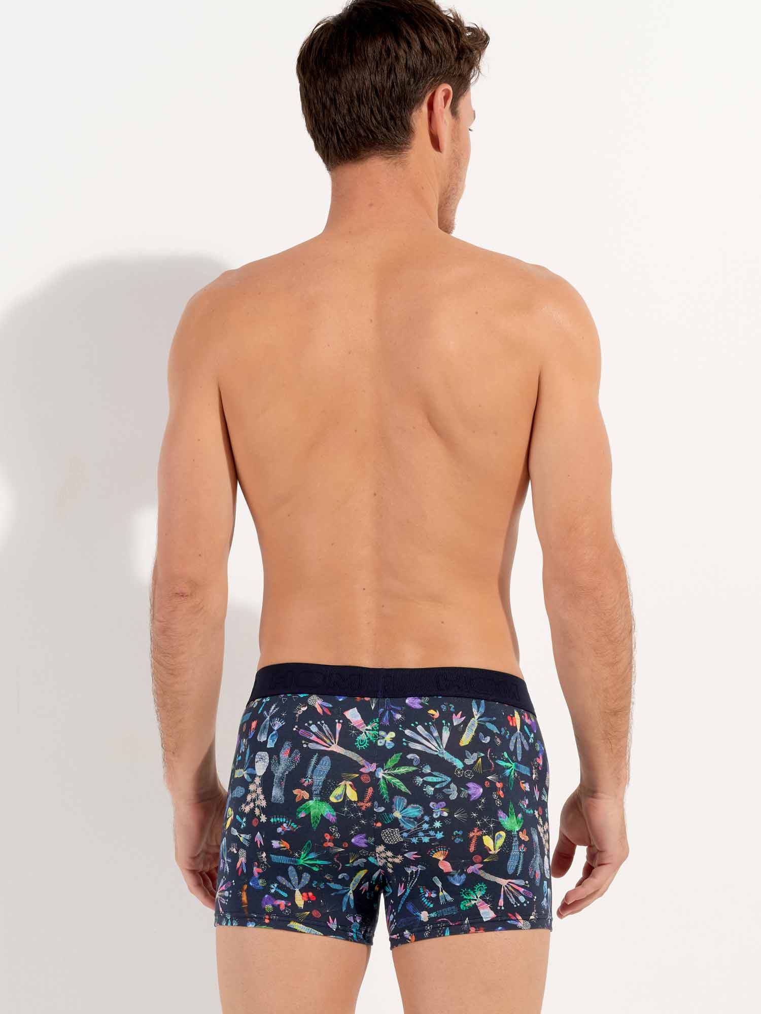 Cactée - Boxer Briefs er lavet af højkvalitets bomuld-modal, et naturligt stof, der føles dejligt blødt. Disse herreboxers har et eksotisk, farverigt planteprint med palmer og kaktusser på en marineblå baggrund. Boxeren har en elastisk marineblå linning med ribstruktur og HOM-logoet i en tone-i-tone effekt.