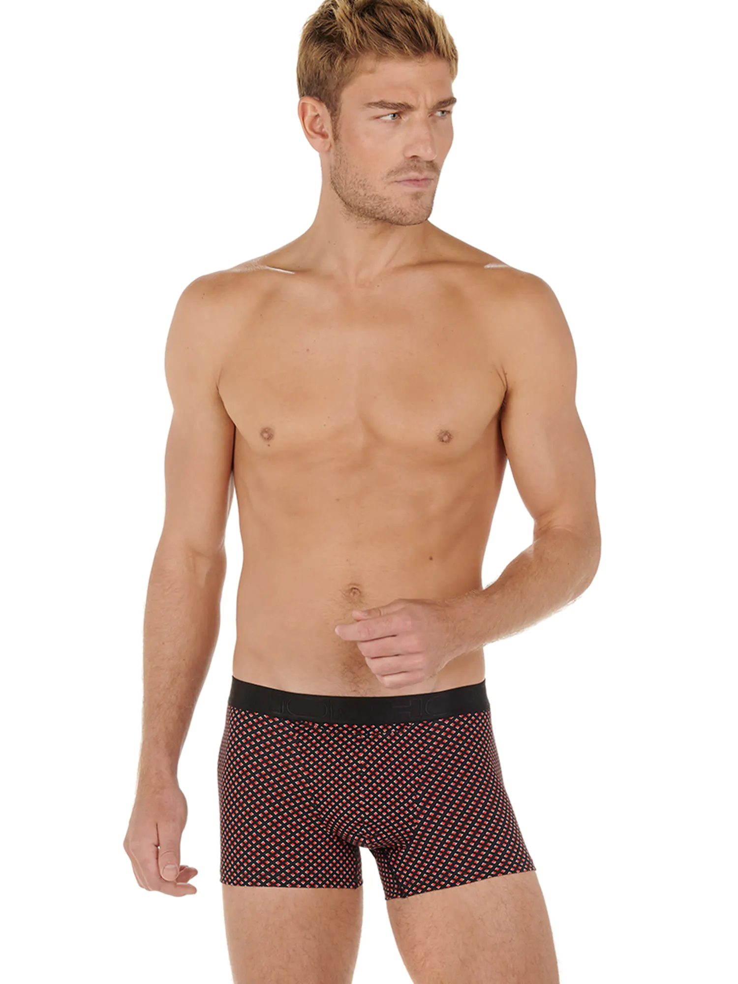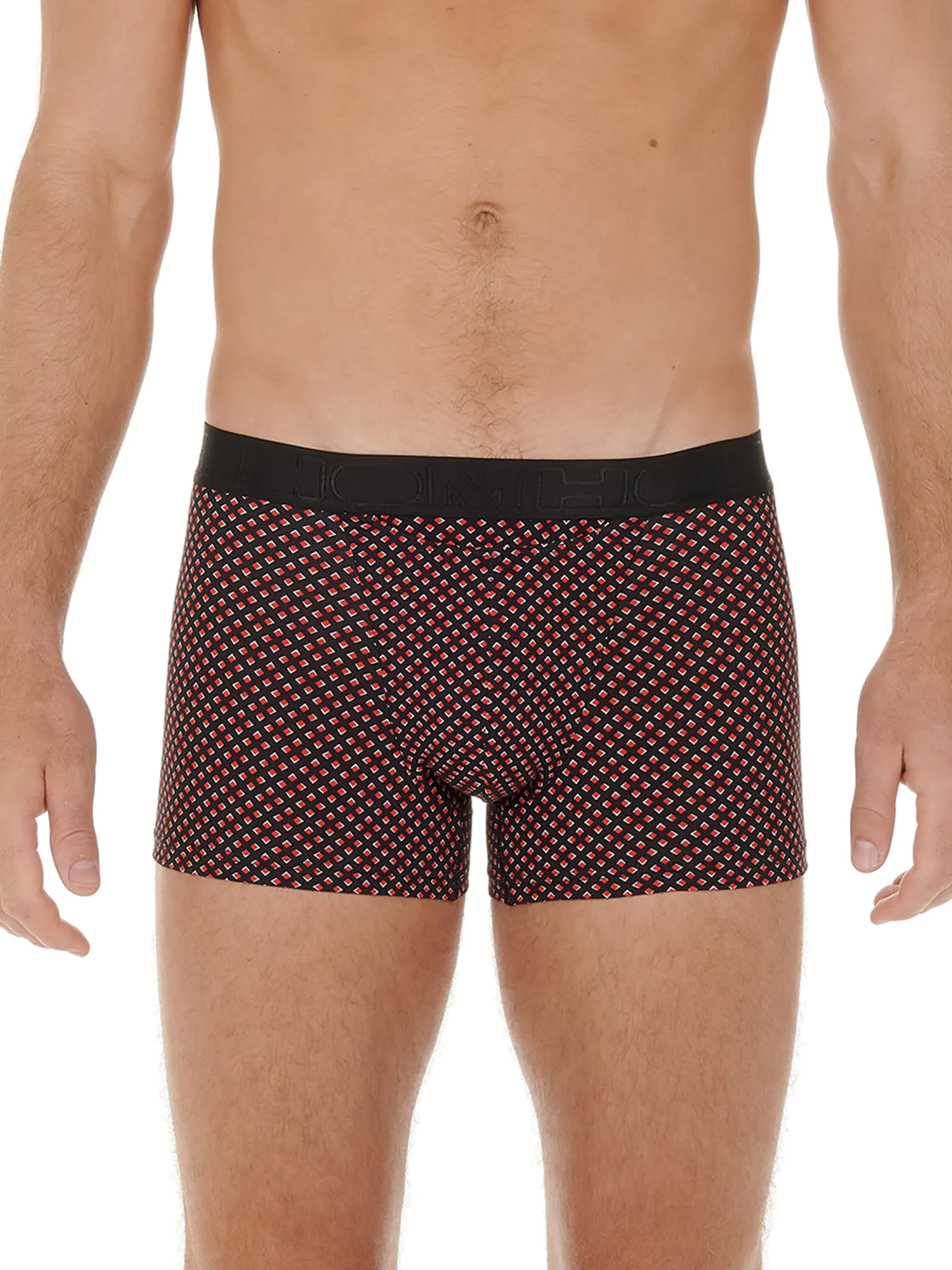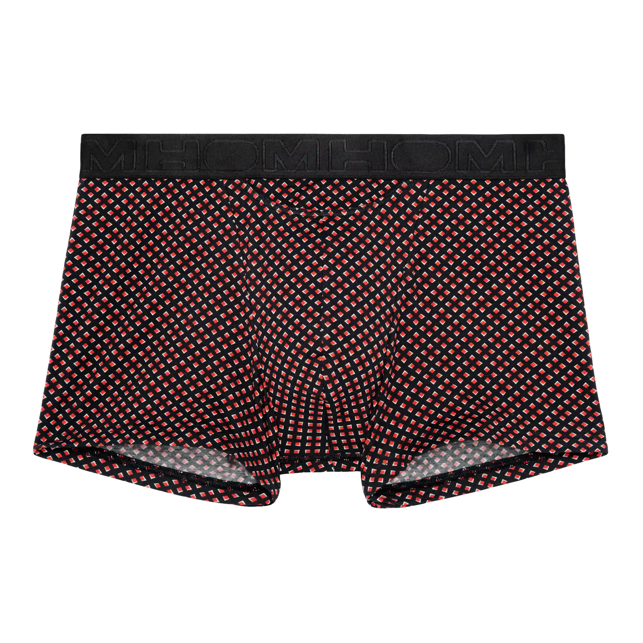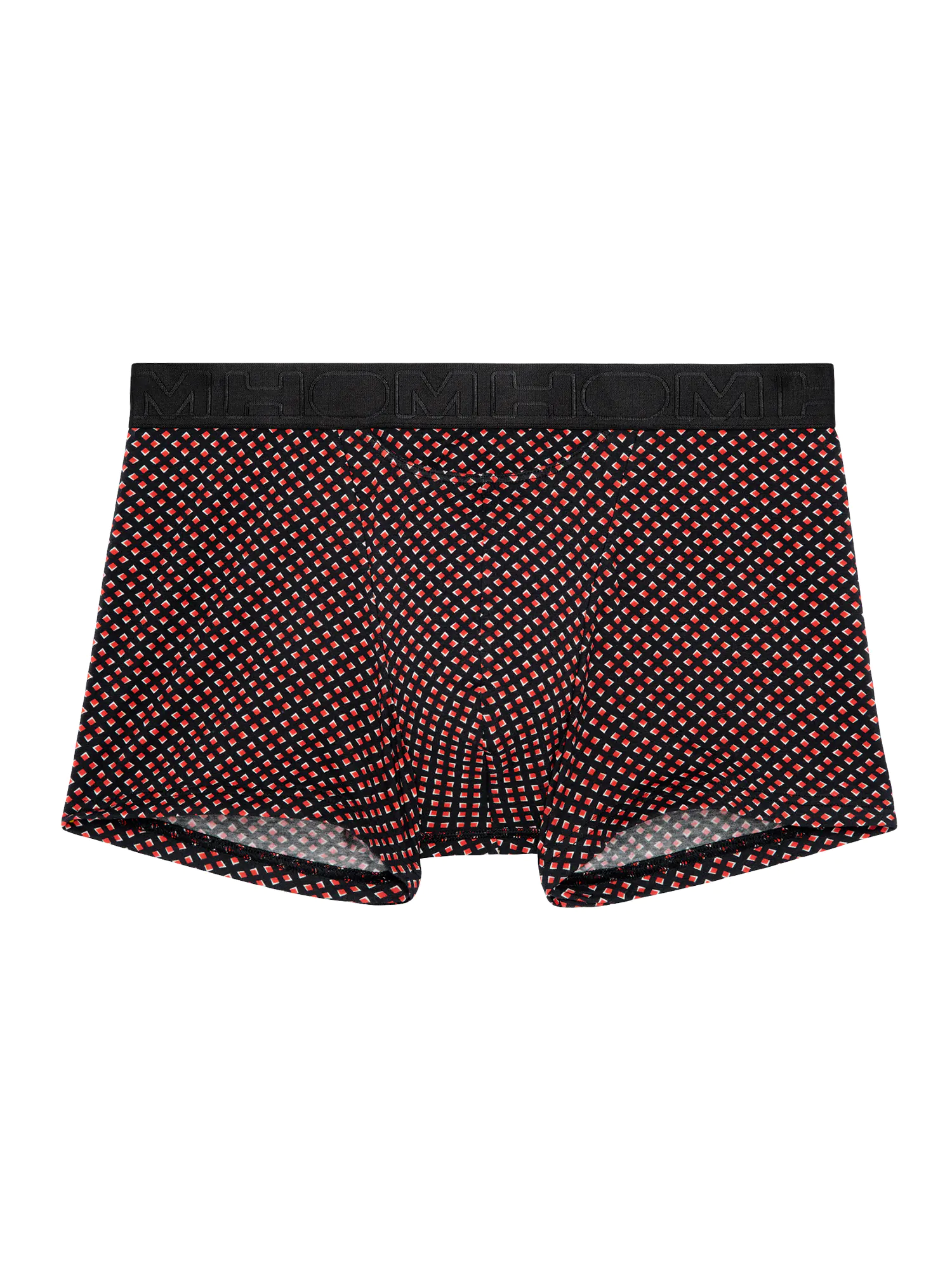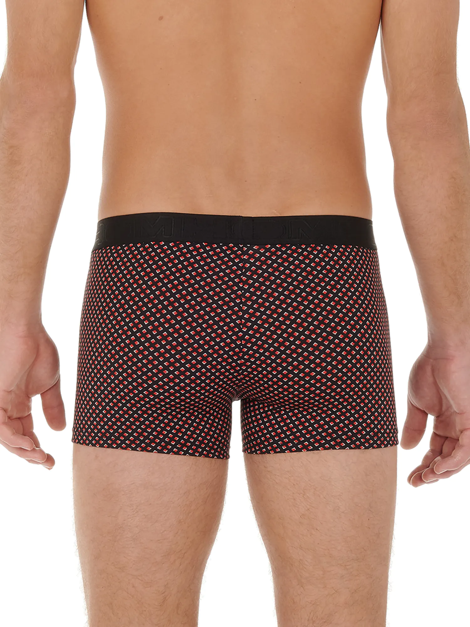 The Murray - HO1 Boxer Brief er lavet af en behagelig bomuld-modal blanding og har HOM's karakteristiske 'horisontale gylp'. Murray har et tofarvet print med et diamantmønster i hvid og rød på en sort baggrund. Bomuld-modal blandingen føles blød og sikrer en pasform, der sidder tæt til kroppen. Derudover har bomuld-modal fremragende absorberende og åndbare egenskaber, så du er meget mindre tilbøjelig til at få varme, fugtige områder i dit undertøj. Da både bomuld og modal har en naturlig oprindelse, er Murray egnet til enhver mand, der kan lide at bære naturlige stoffer. Ved normalt brug er stoffet modstandsdygtigt over for krympning og slid. Boxerbriefen har en bred elastisk linning med HOM-logoet hele vejen rundt.