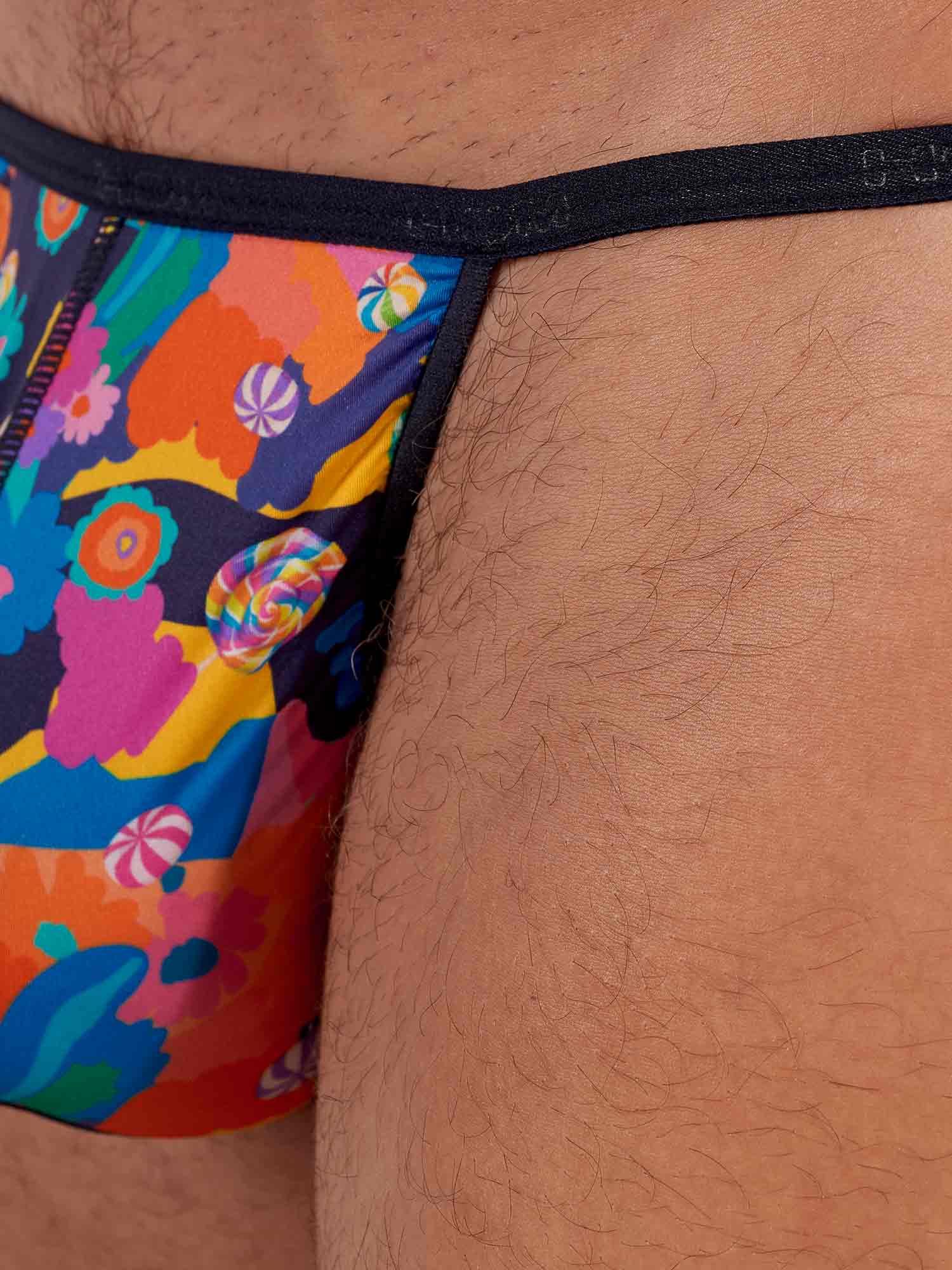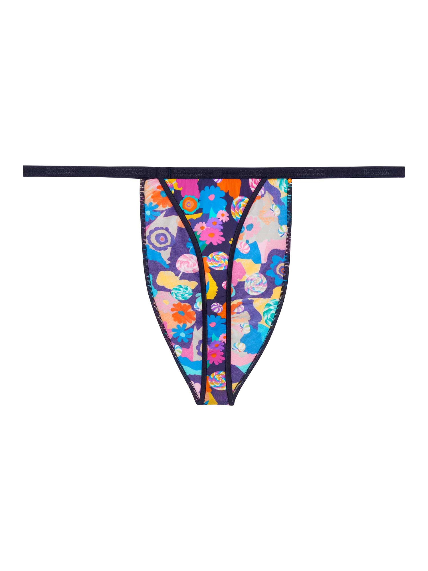 Wonka G-strengen fra HOM Temptation-kollektionen er skabt til forførelse med et legende twist. Den ultralette mikrofiber, identisk med HOM Plumes, smyger sig om kroppen som et ekstra lag hud. Det farverige print med slik og psykedeliske blomster giver et iøjnefaldende og dristigt udtryk. Et modigt valg for mænd, der ønsker minimal dækning og maksimal effekt.
