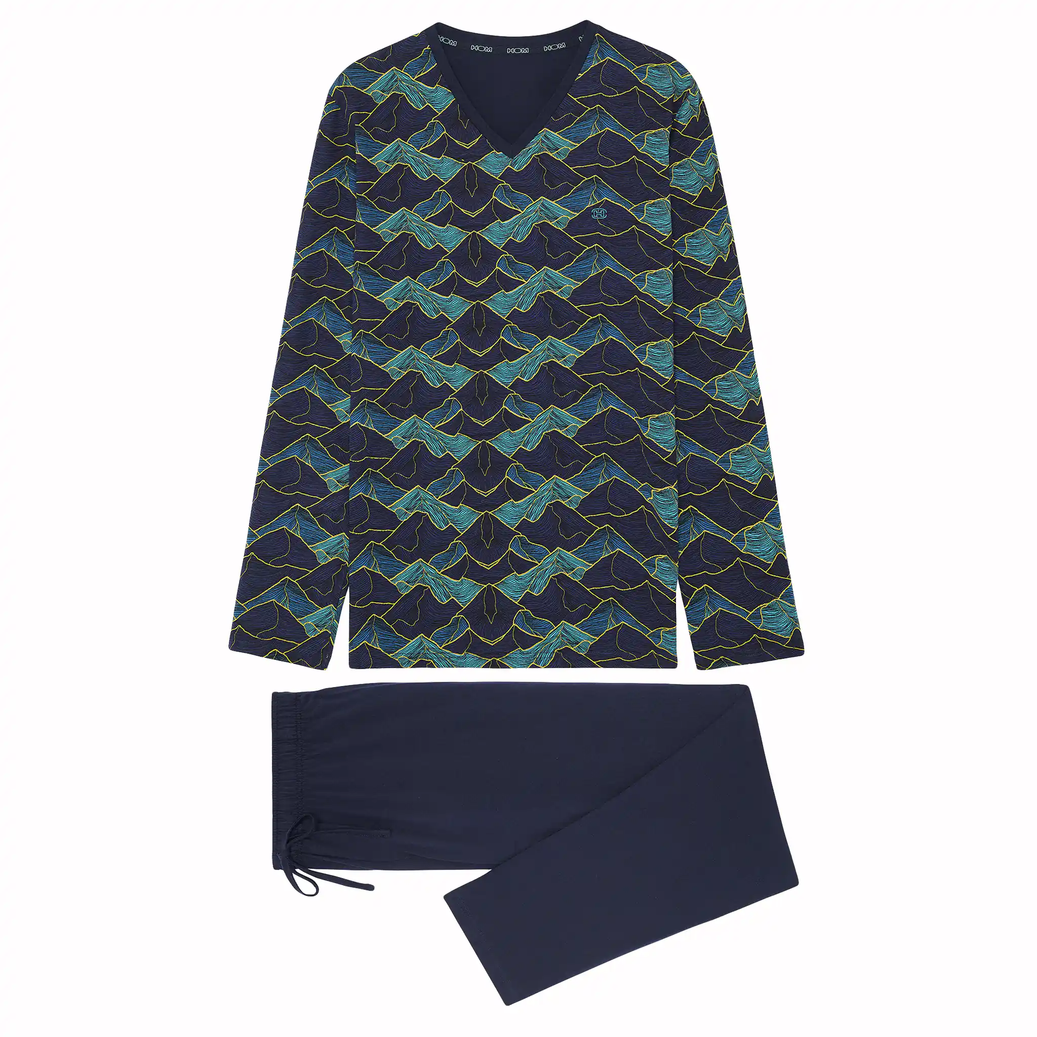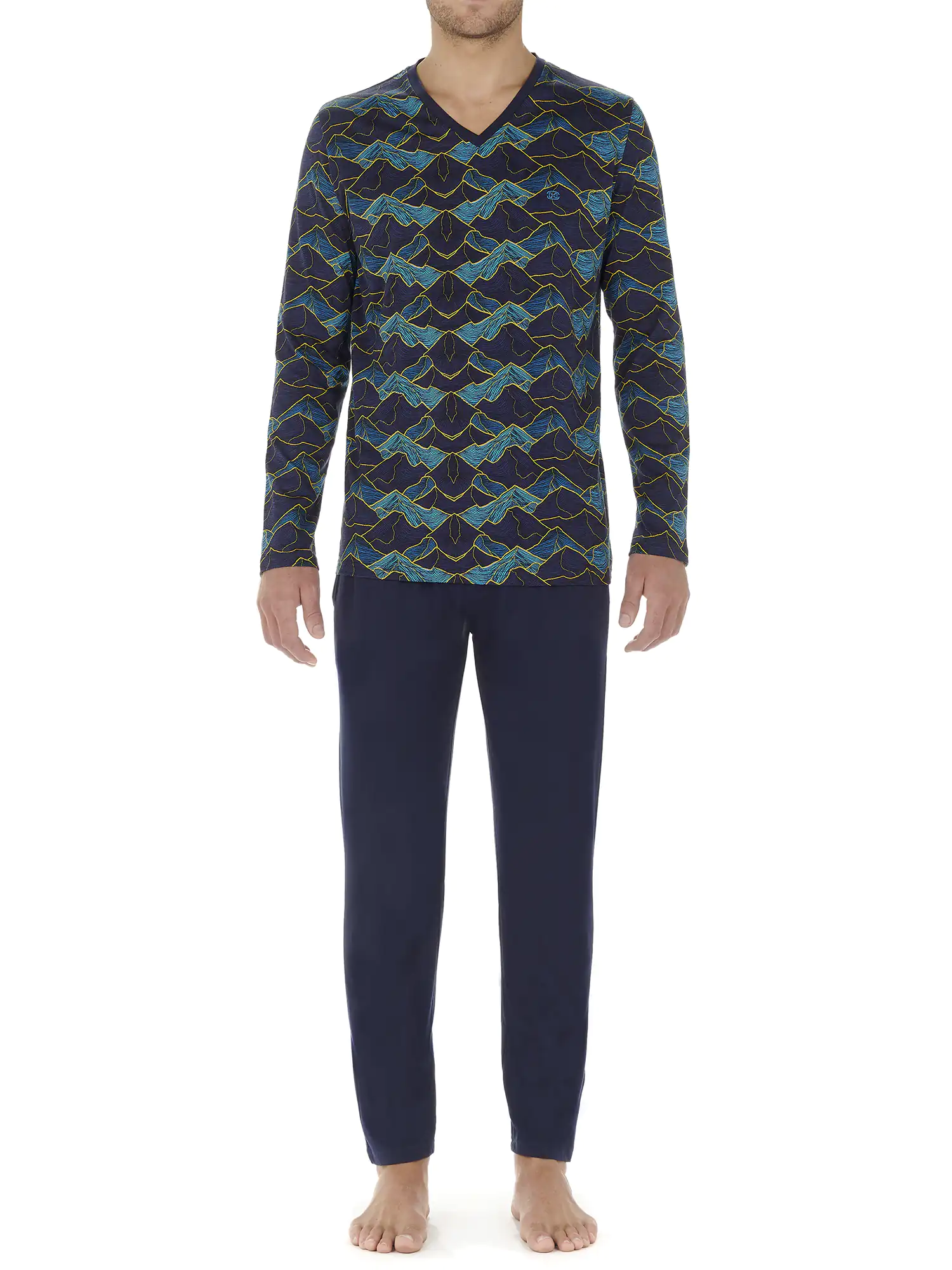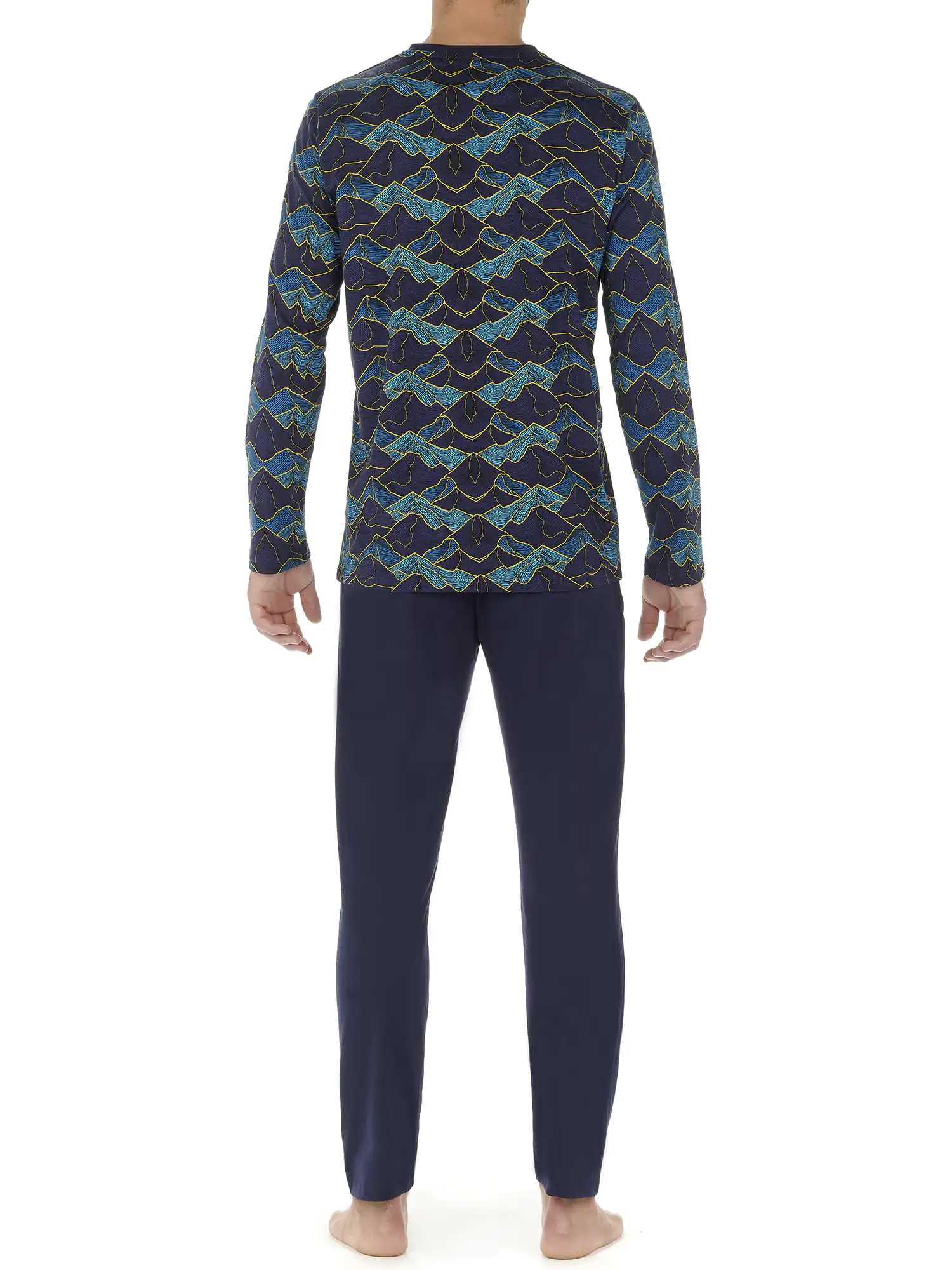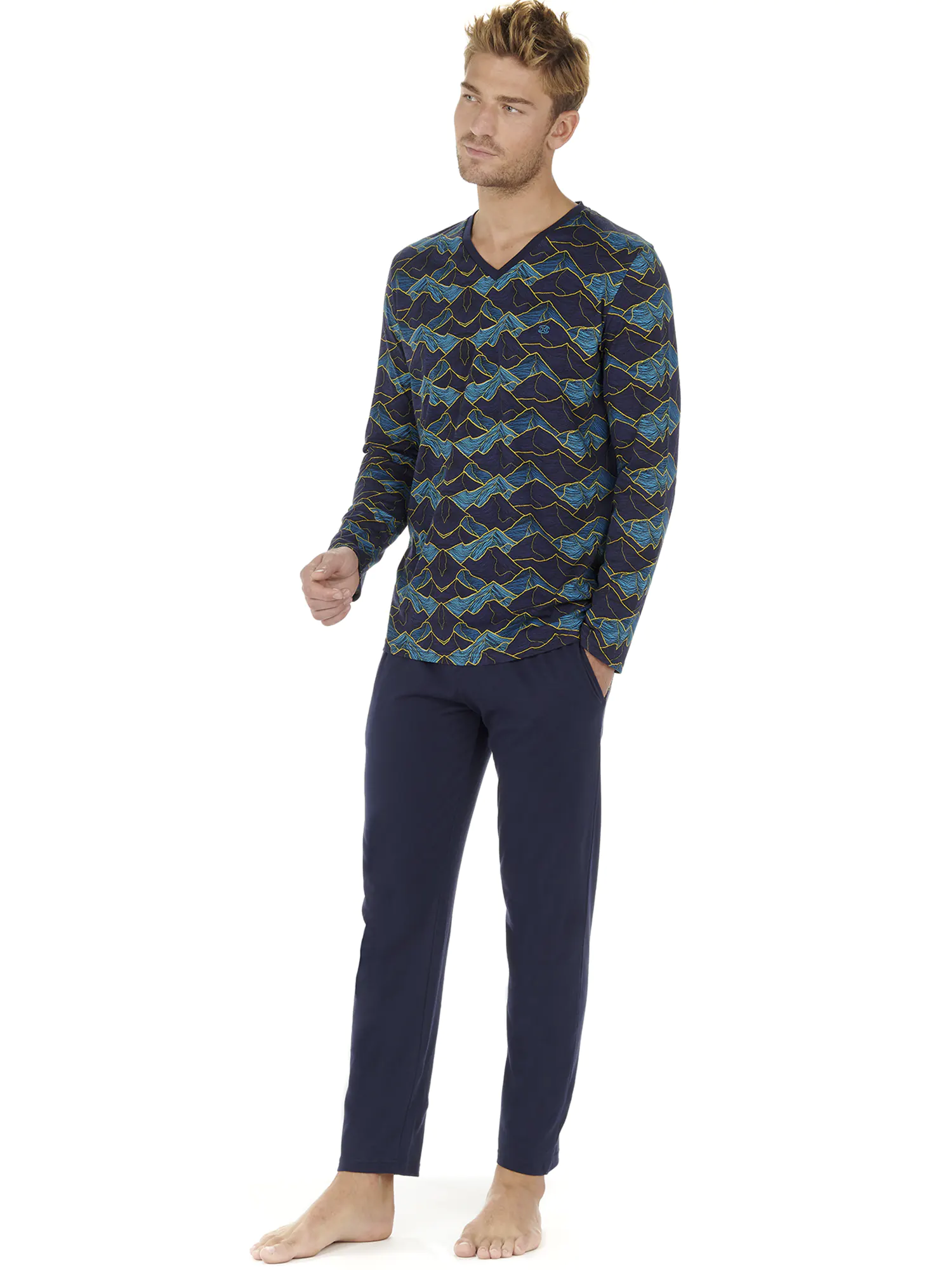 Lino herrepyjamas er lavet af 100% jerseykvalitet bomuld. Langærmet T-shirt har en V-hals. Skjorten har et iøjnefaldende all-over landskabsprint af bjerge i blå nuancer på en marineblå baggrund. De ensfarvede marineblå lange bukser har sidelommer i sømmen på venstre og højre side. Taljebåndet er elastisk og har en snor. Fordi pyjamasen er lavet af bomuld, er den nem at rengøre og åndbar. Perfekt til manden, der kan lide at bære naturlige stoffer.
