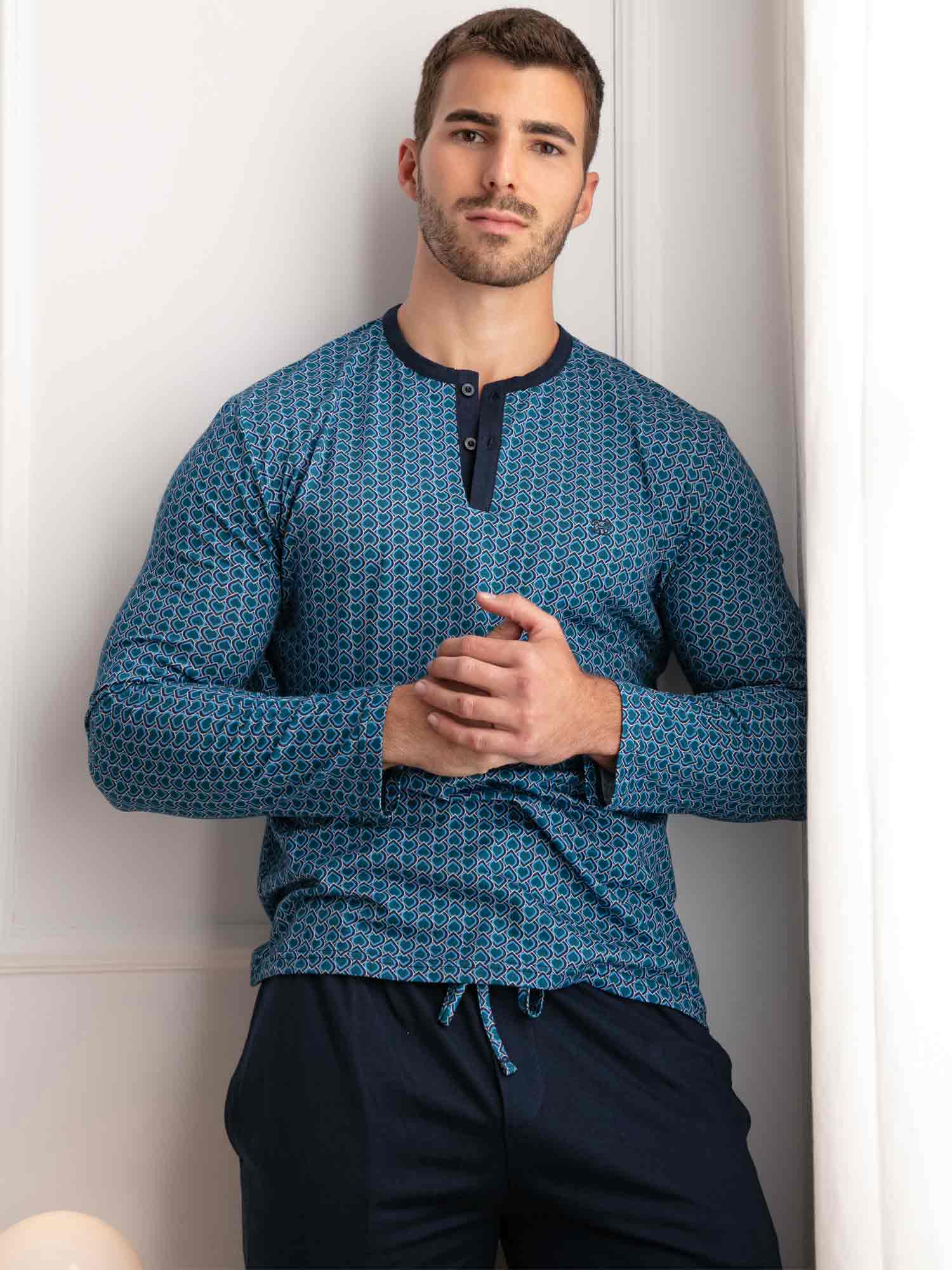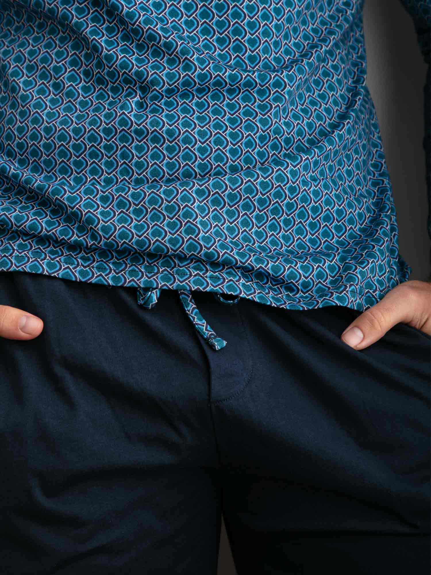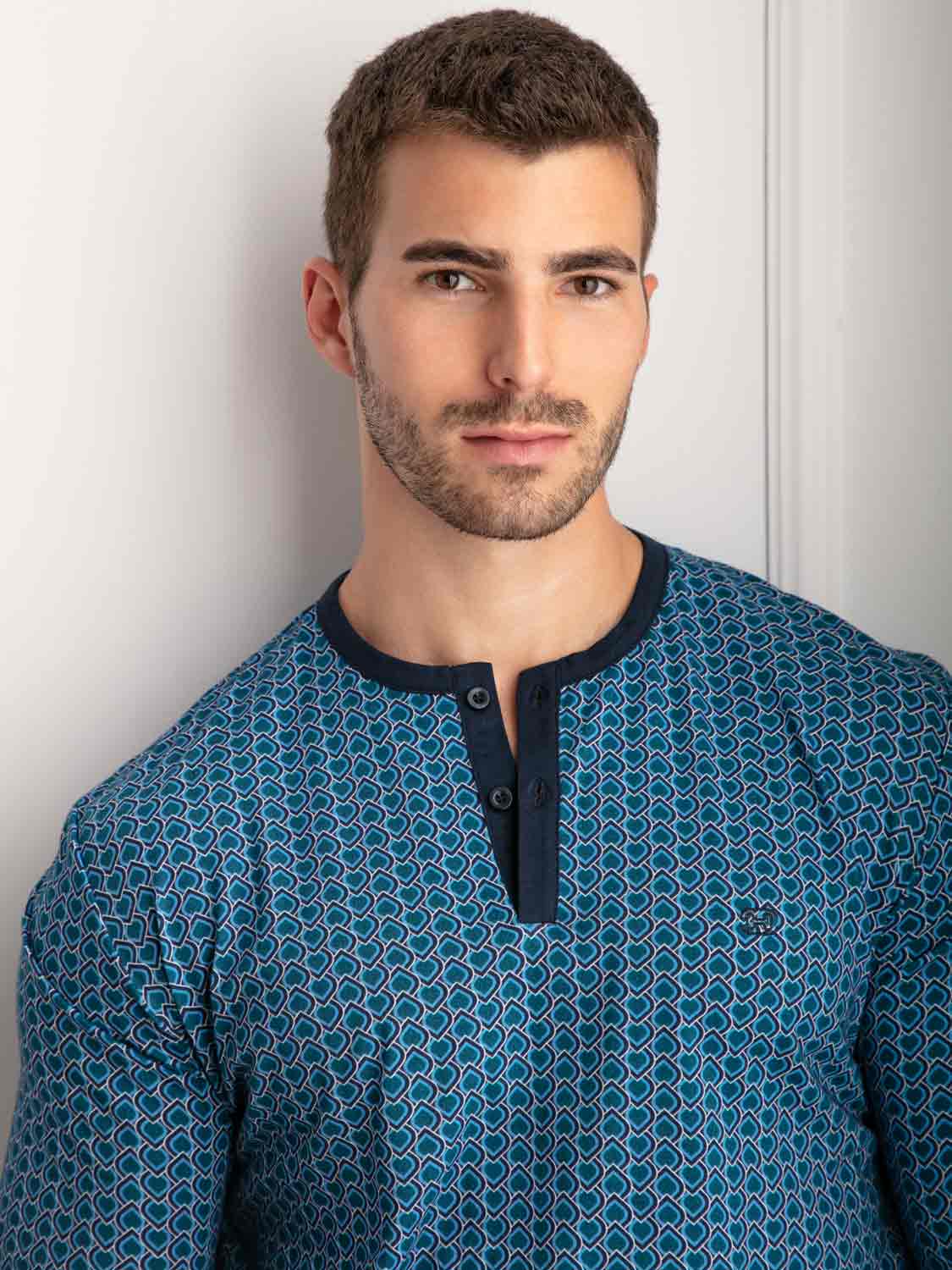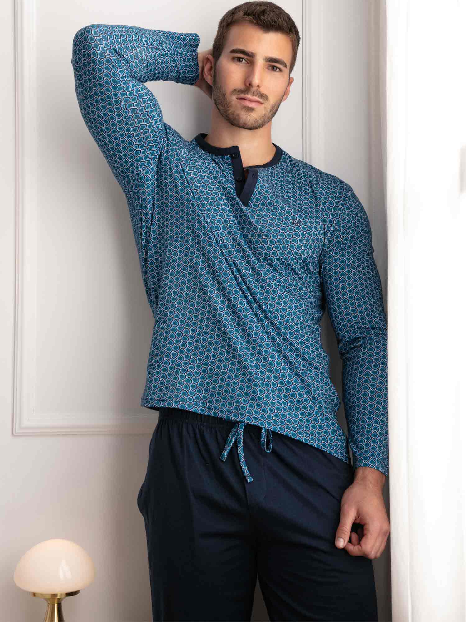Martinez lang pyjamas fra HOM hylder Art Deco-periodens raffinerede linjer. Det grafiske skælmønster i blå og turkis nuancer, inspireret af egyptiske ornamenter, giver et elegant og markant udtryk. Den tuniske krave og den kontrasterende knaplukning tilfører et stilfuldt touch. Fremstillet af 100% bomuld, som føles behageligt blødt mod huden og giver fremragende komfort. Perfekt til afslappede aftener og rolige nætter.