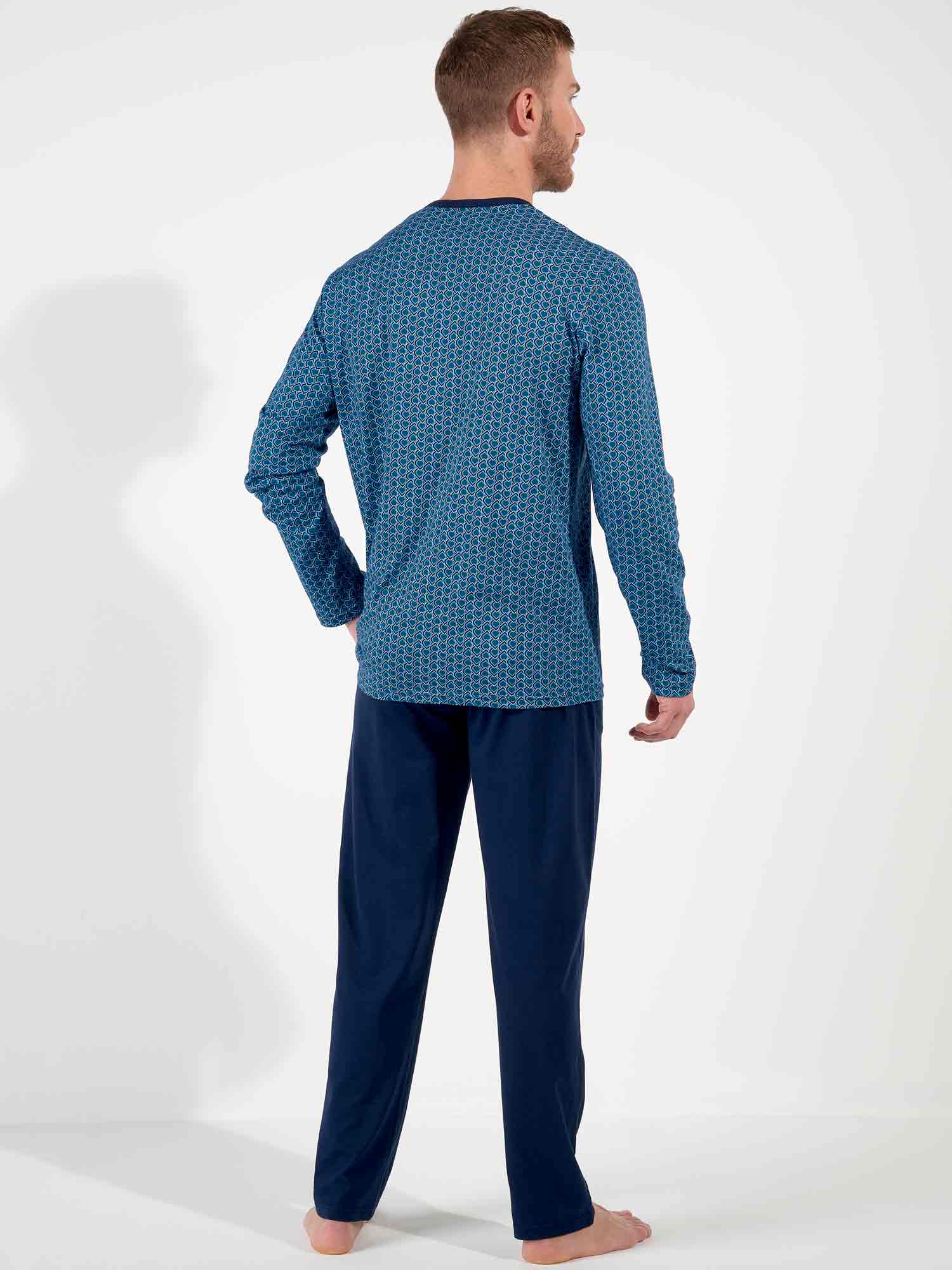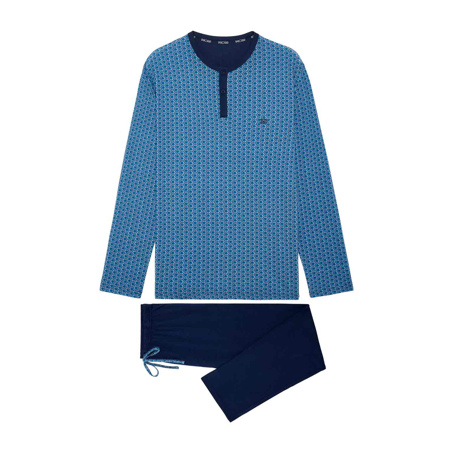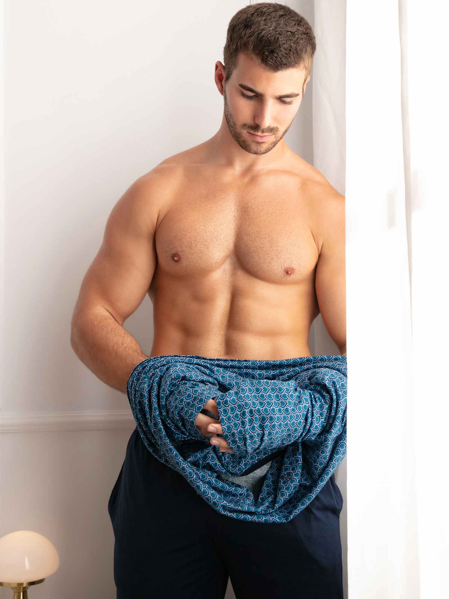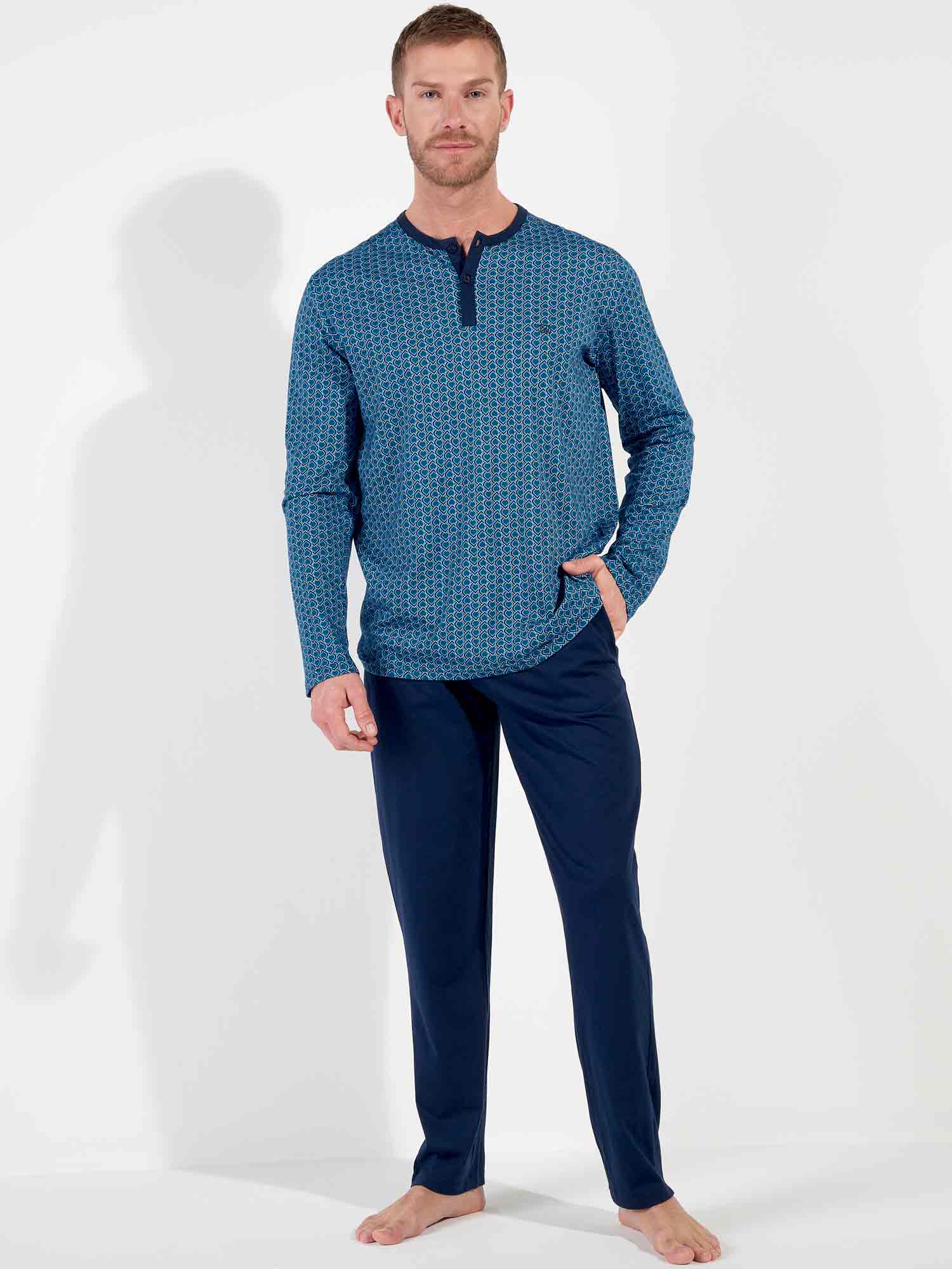 Martinez lang pyjamas fra HOM hylder Art Deco-periodens raffinerede linjer. Det grafiske skælmønster i blå og turkis nuancer, inspireret af egyptiske ornamenter, giver et elegant og markant udtryk. Den tuniske krave og den kontrasterende knaplukning tilfører et stilfuldt touch. Fremstillet af 100% bomuld, som føles behageligt blødt mod huden og giver fremragende komfort. Perfekt til afslappede aftener og rolige nætter.
