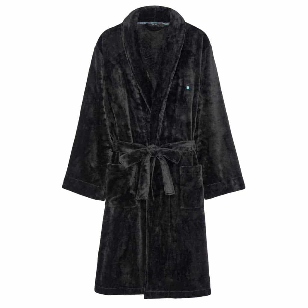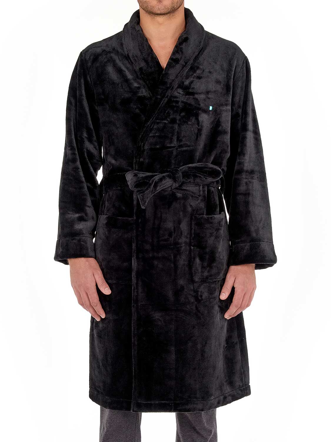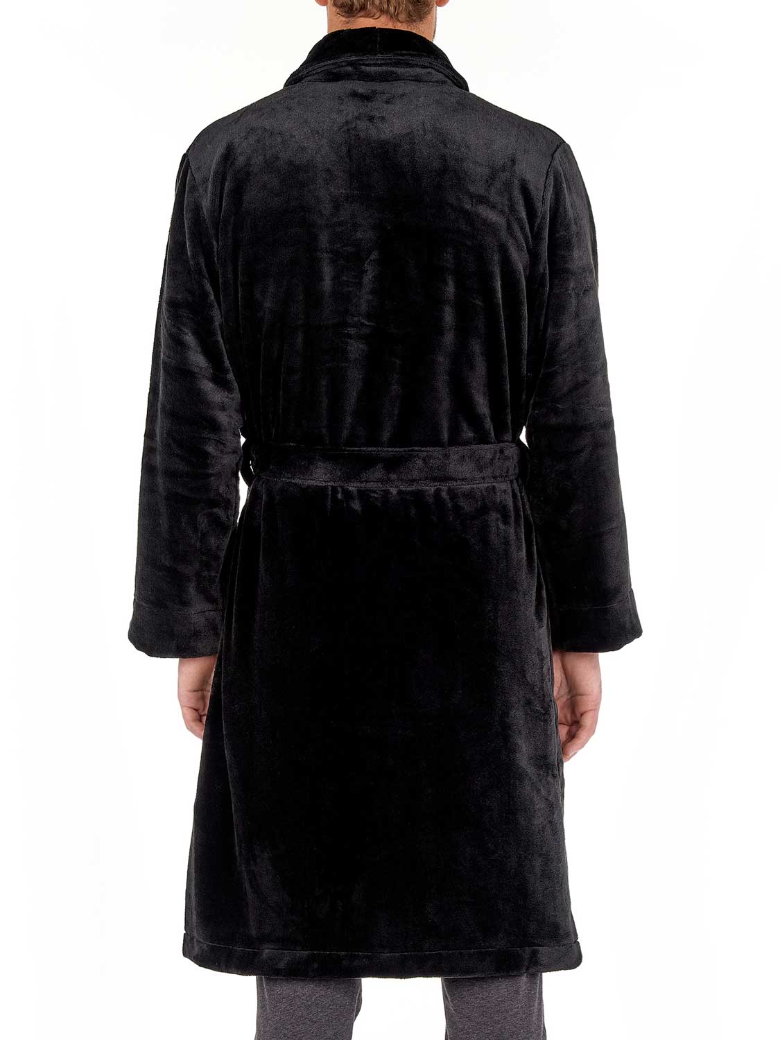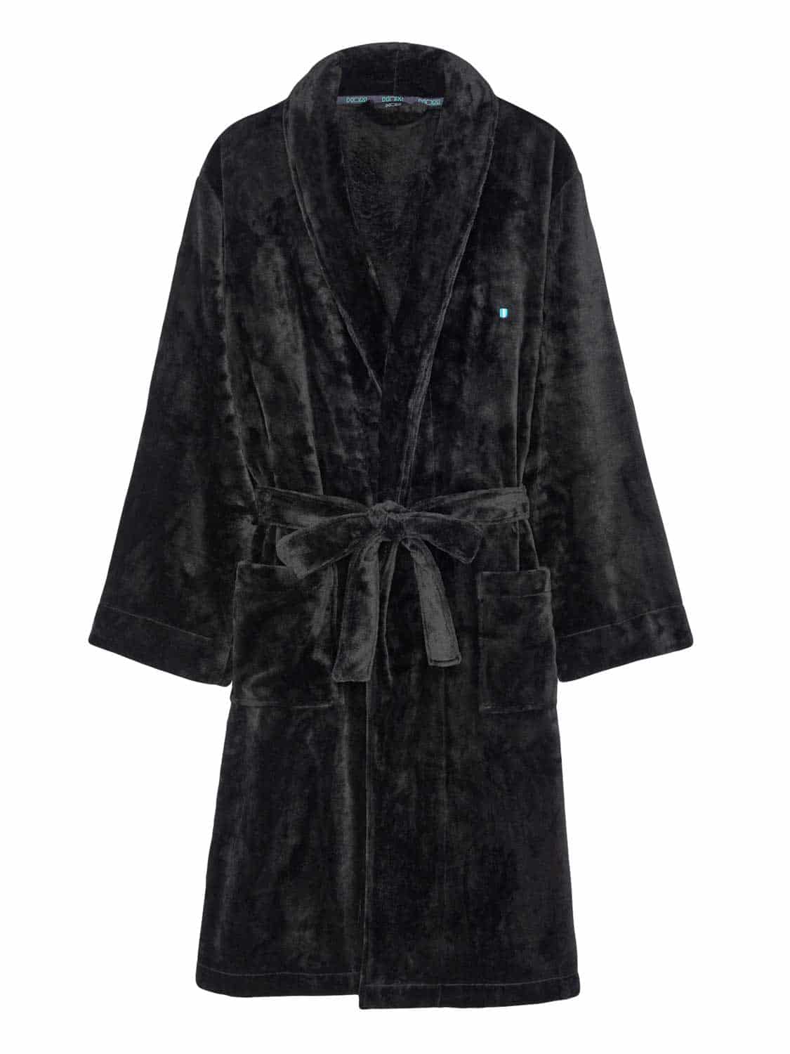 Robe - Nice er lang og falder over knæene. Kåben er lavet af tykt, blødt polyesterfleece-materiale, som fremragende regulerer temperaturen og holder dig varm. Kåben er sort med en let glans. Halsudskæringen er indvendigt færdiggjort med HOM logotape. Du lukker kåben med bæltet rundt om din talje.