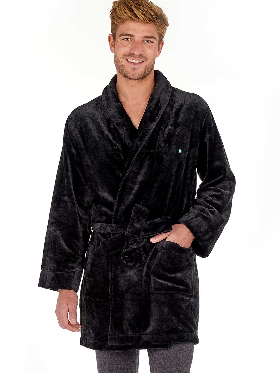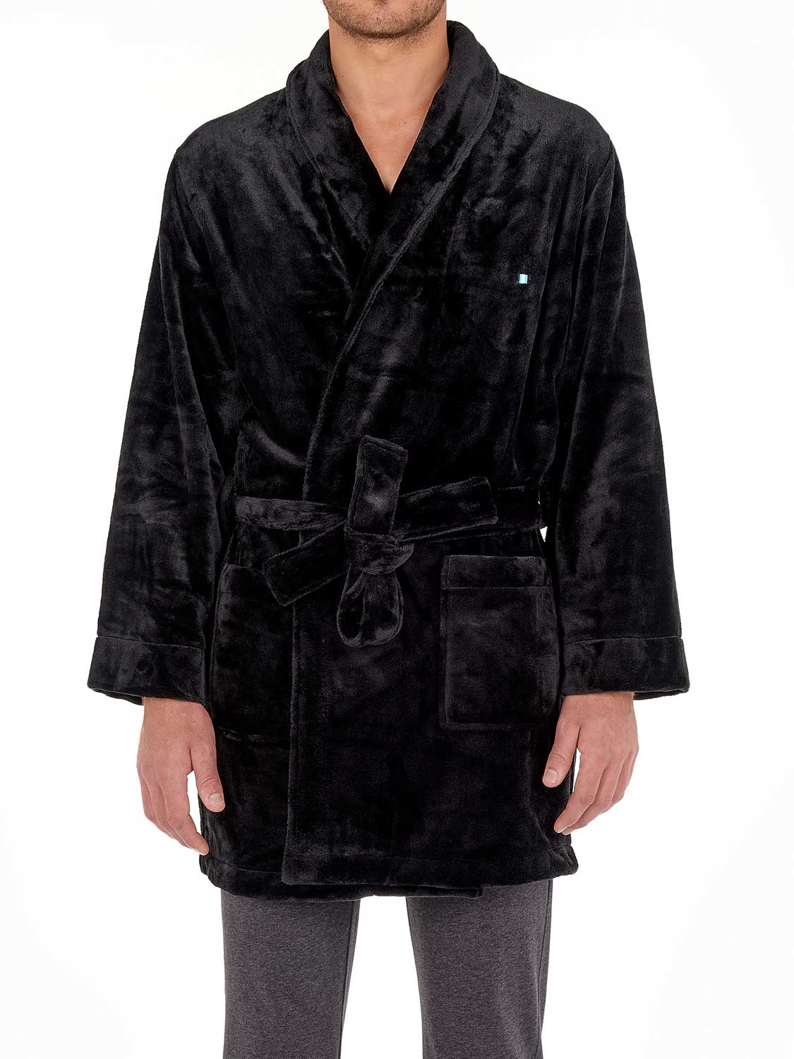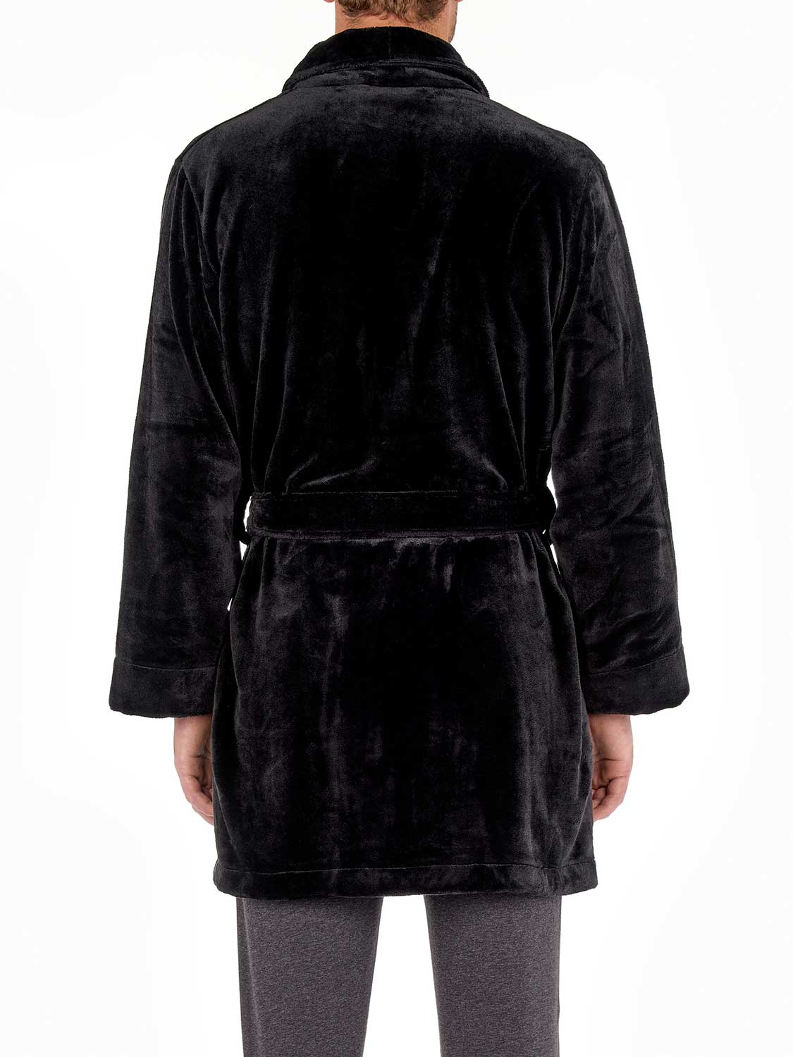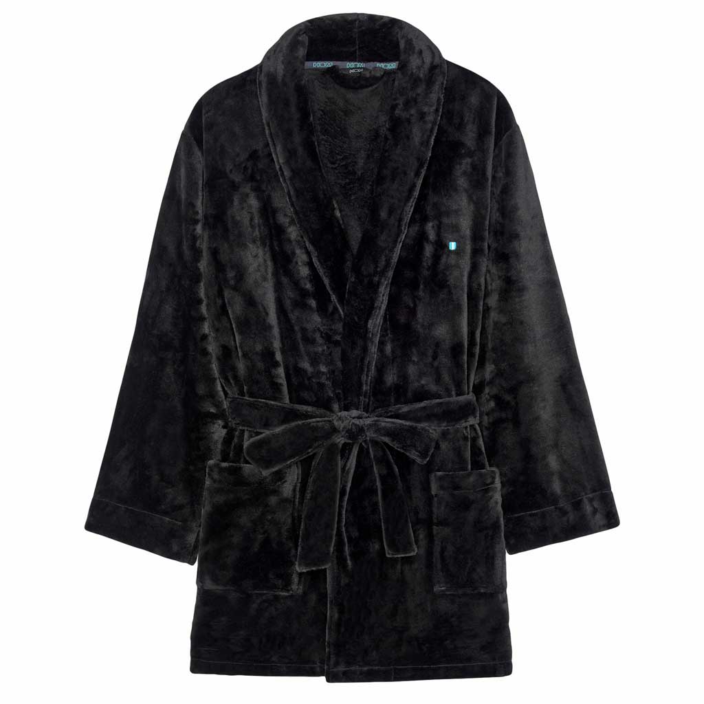 Robe Short - Nice er kort i længden og falder over knæene. Kåben er lavet af tykt, blødt polyesterfleece-materiale, som fremragende regulerer temperaturen og holder dig varm. Kåben er sort med en let glans. Halsudskæringen er indvendigt færdiggjort med HOM logotape. Du lukker kåben med bæltet rundt om din talje.