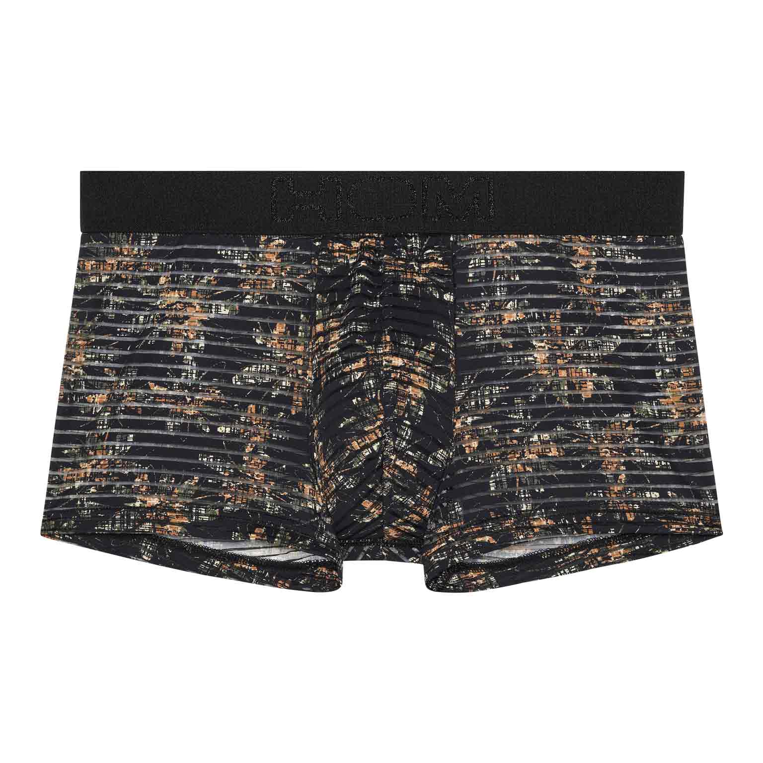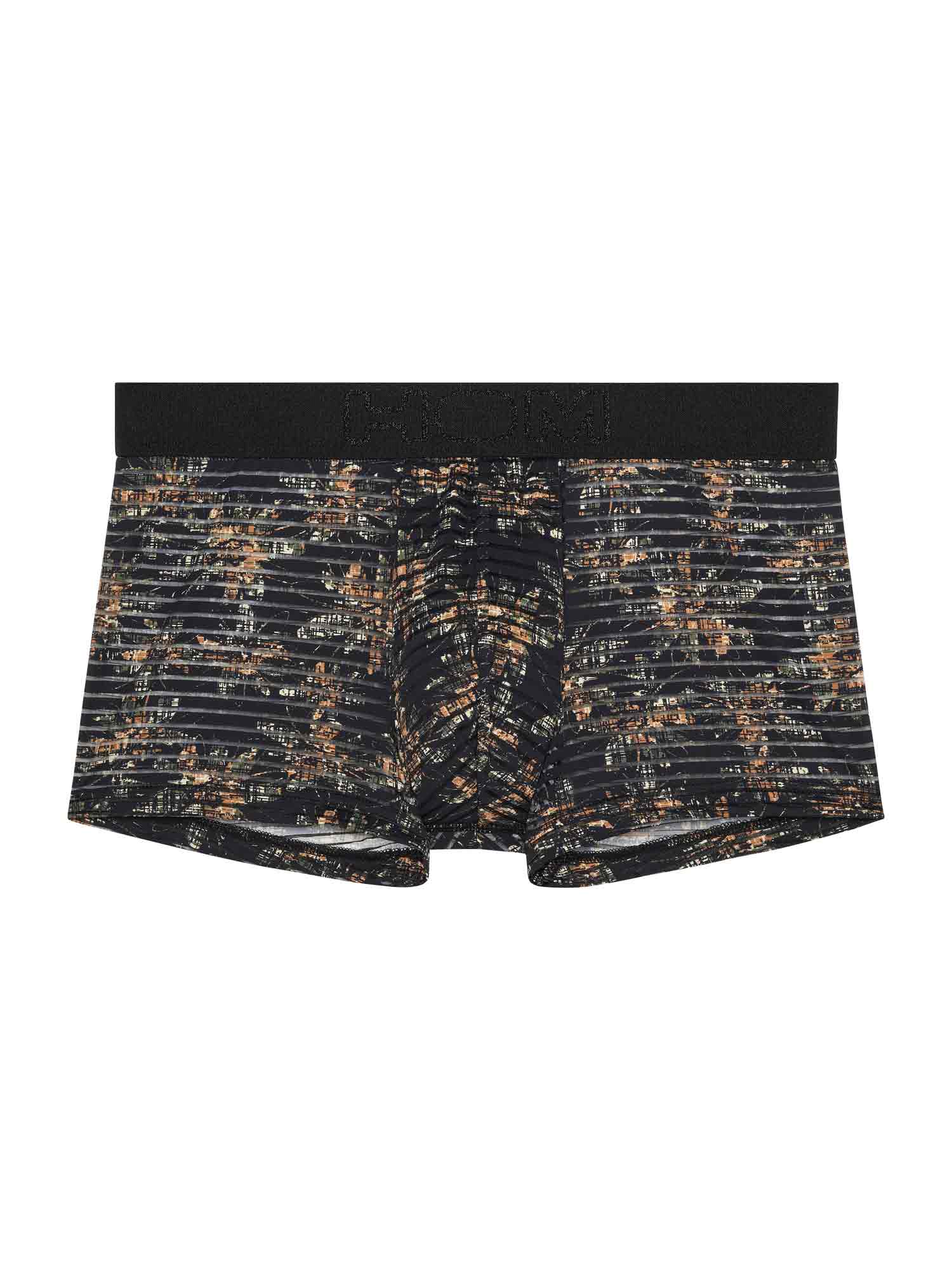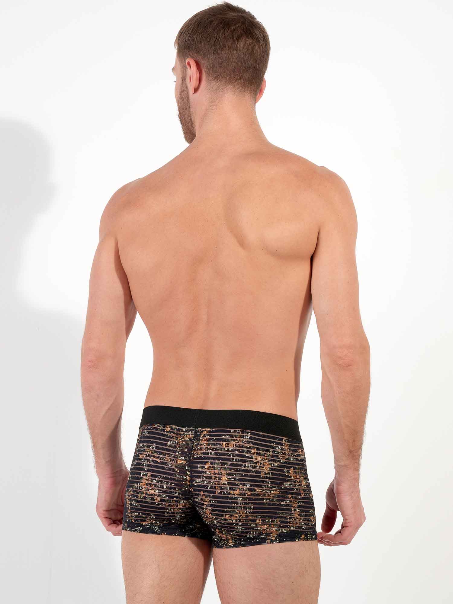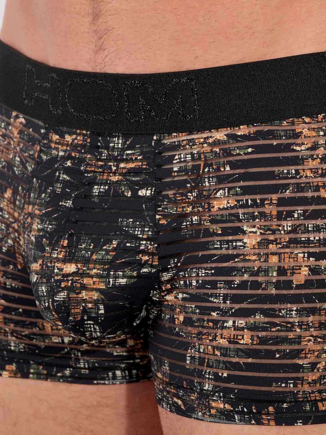 Iraty trunk fra HOM Temptation-kollektionen er et mesterværk i subtil forførelse. Den kombinerer et sanseligt camouflageprint i grøn, okker og sort med blomsterdetaljer, der inviterer til nærmere kig. De gennemsigtige vandrette striber afslører lige akkurat nok hud, mens den fløjlsbløde mikrofiber former sig perfekt til kroppen. Den forede front giver ekstra komfort og en flatterende pasform. Iraty trunk er til manden, der tør forføre med stil og selvtillid.