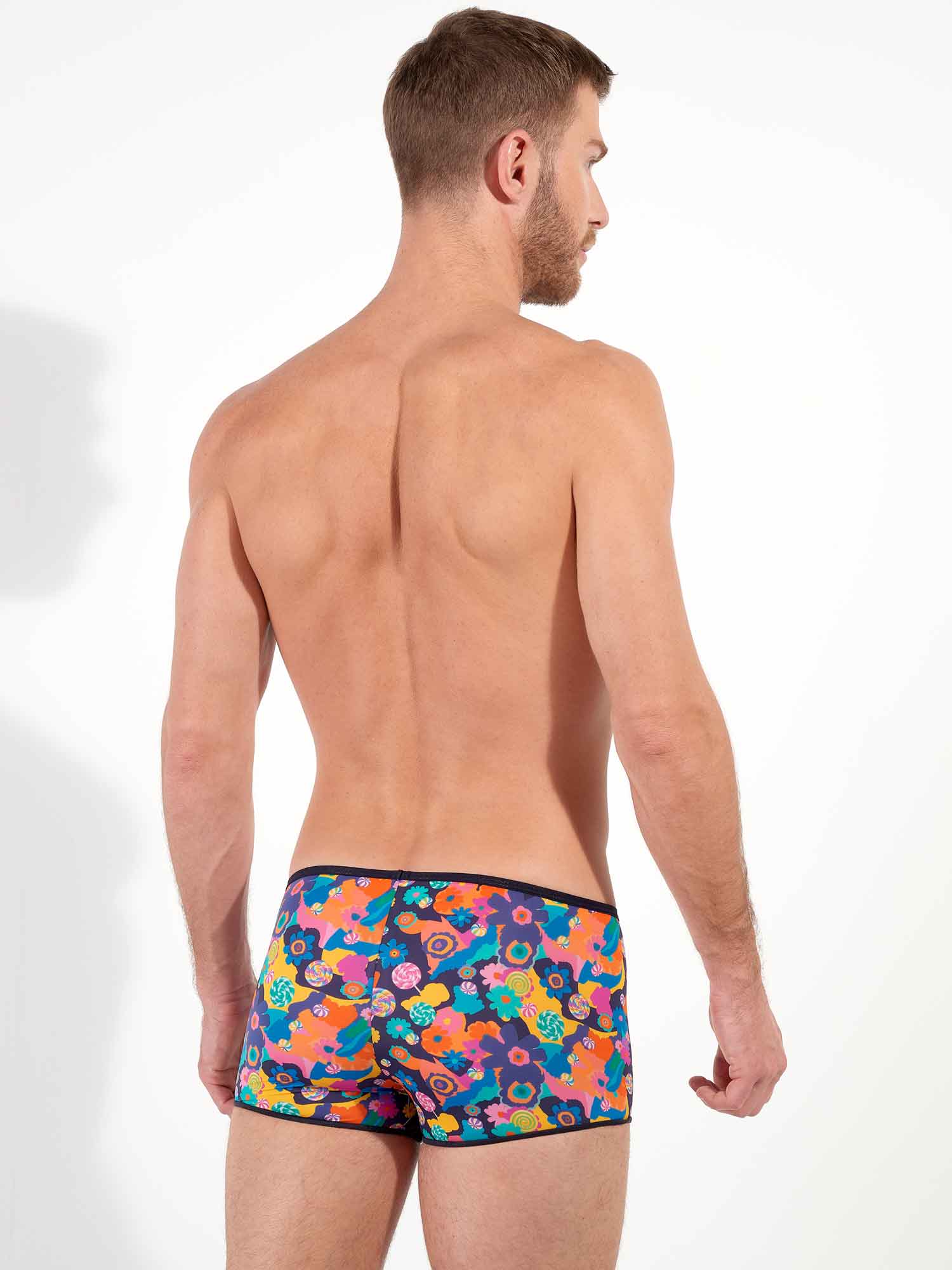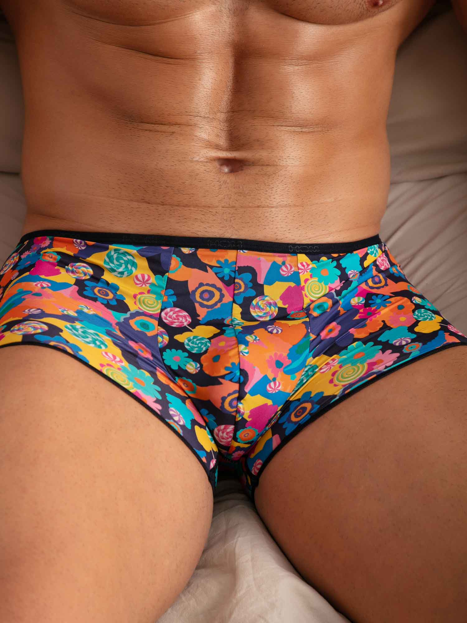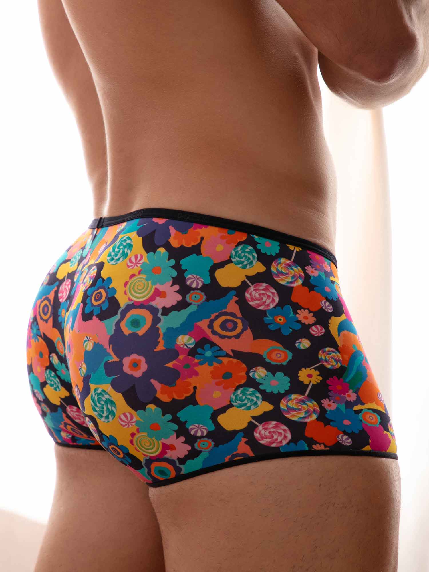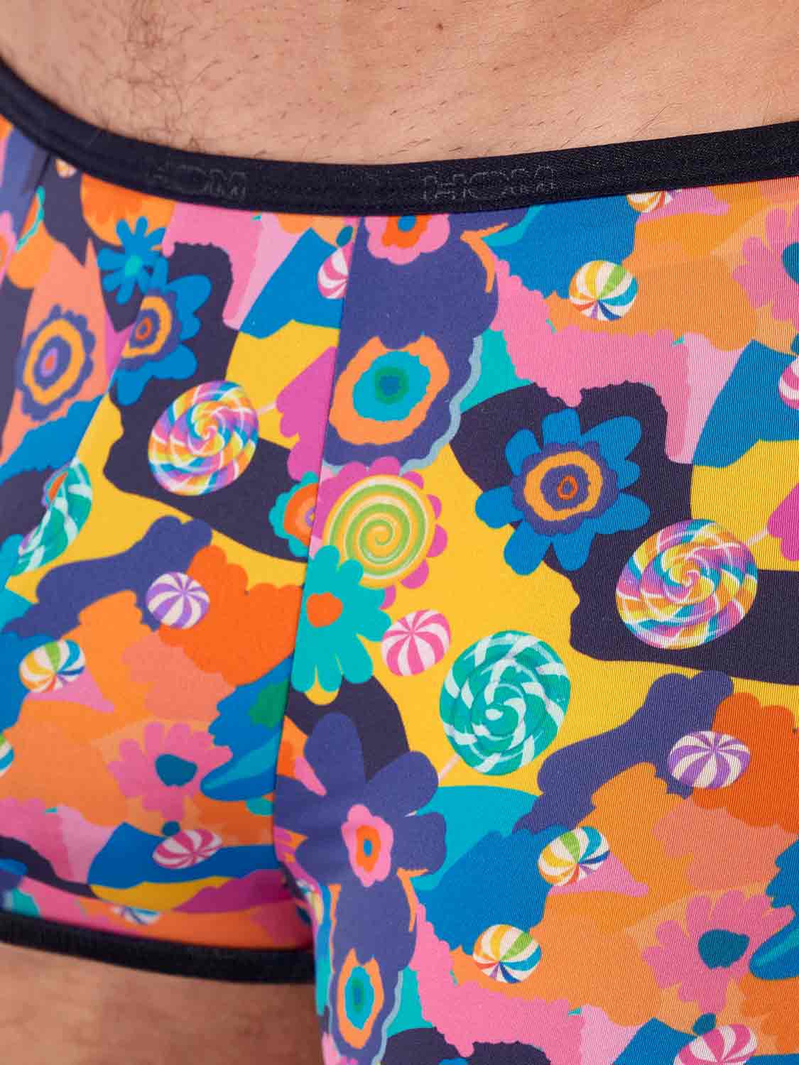 Wonka trunk fra HOM Temptation-kollektionen er alt andet end almindelig. Fremstillet af HOM’s ikoniske Plume-materiale, sidder den ultralette mikrofiber tæt mod kroppen og bevæger sig som en anden hud. Printet kombinerer farverigt slik med hallucinerende blomster for et legende, men forførende look. Et markant valg for den selvsikre mand, der går sine egne veje.