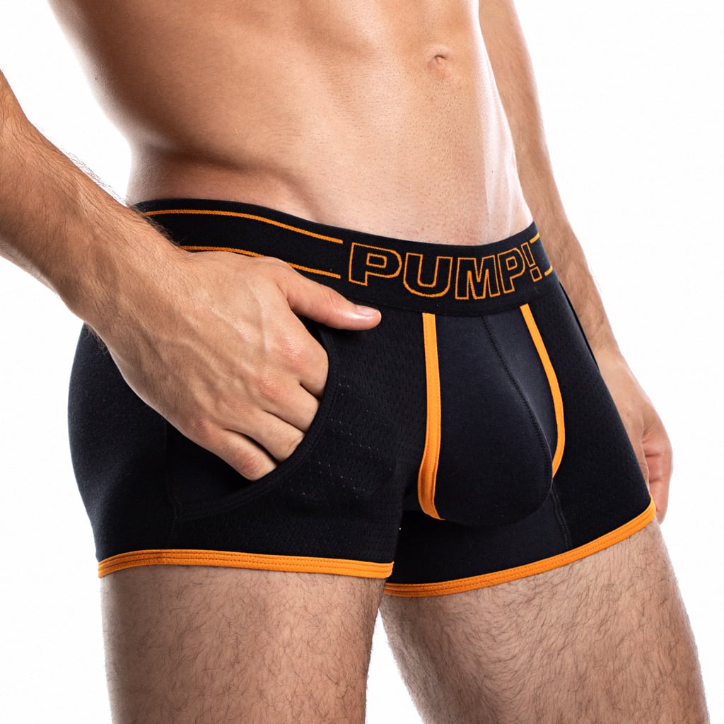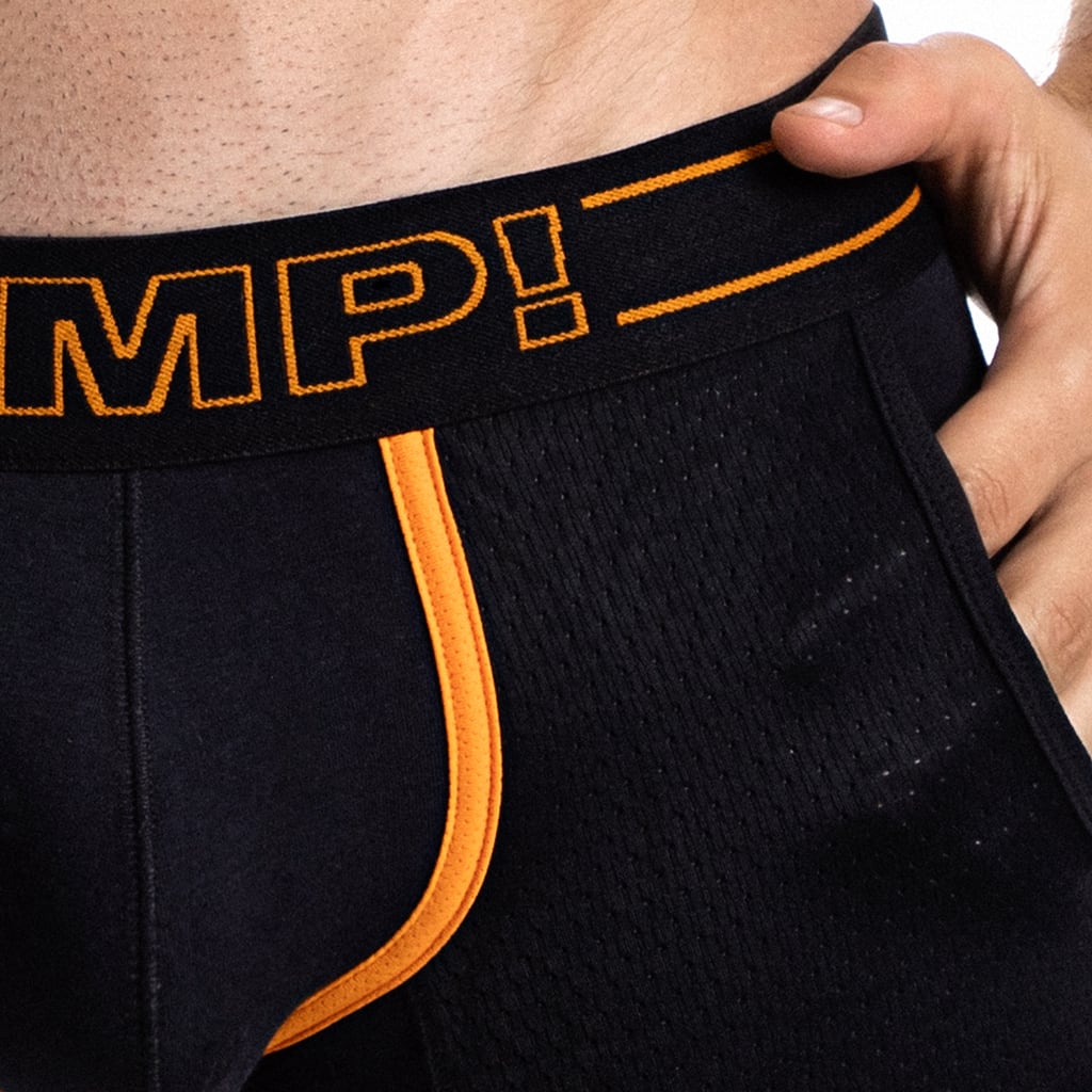 Med PUMP! Nightlight Jogger, suser du gennem natten. Joggeren er designet med en strømlinet og behagelig pasform, med blød fin mesh på kroppen, benene og koppen for optimal åndbarhed. Joggeren er lavet af strækbomuld og kommer i sort med orange piping og syninger. PUMP! taljebåndet er 4,5 cm bredt. Joggeren har praktiske lommer på venstre og højre side.