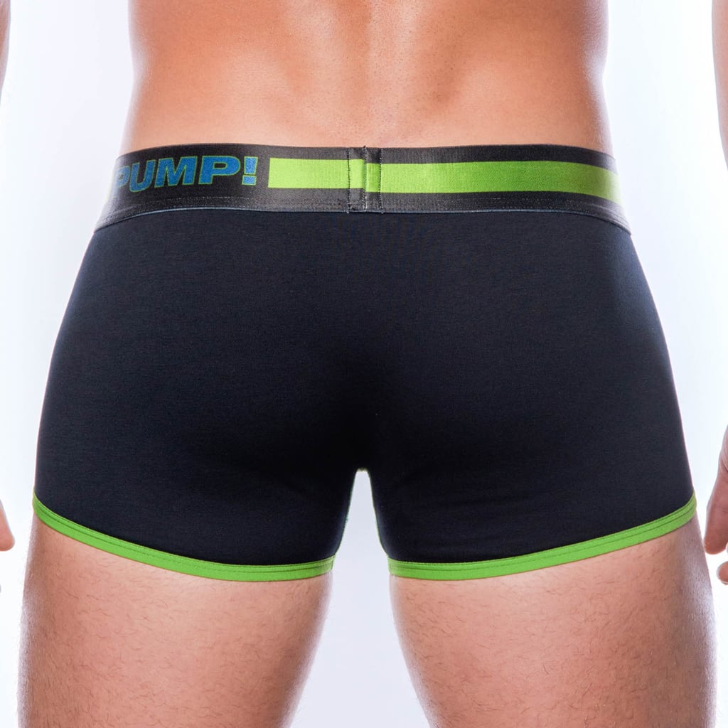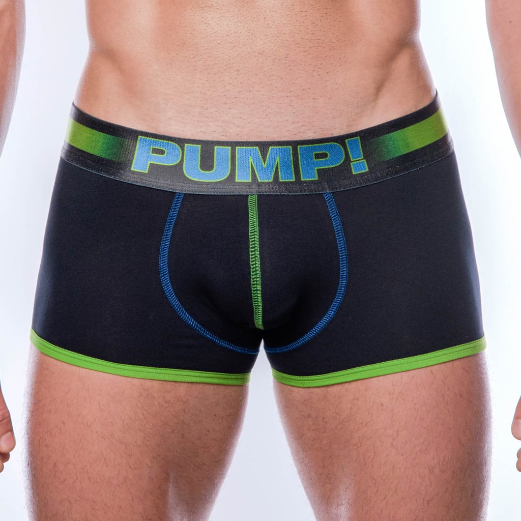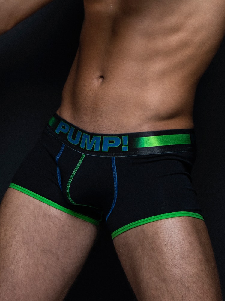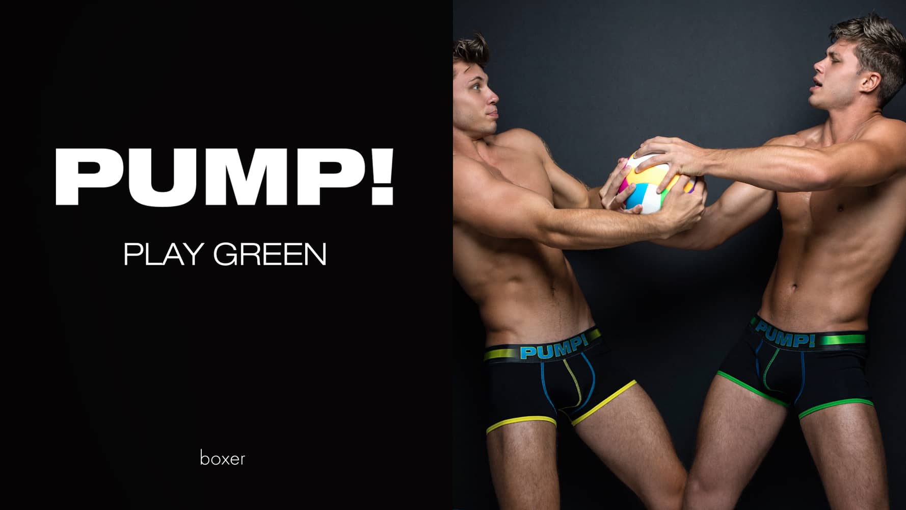 Den nye PLAY-serie fra PUMP! Underwear. Boksershortsene er legende designet med en 4,5 cm bred taljebånd. PLAY-boksershortsene er lavet af strækbomuld for den perfekte pasform, og den grønne bokser har gul og blå syning og piping.