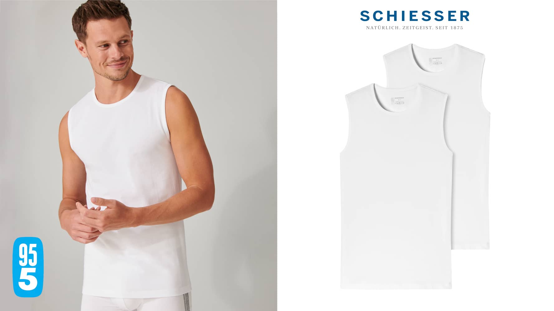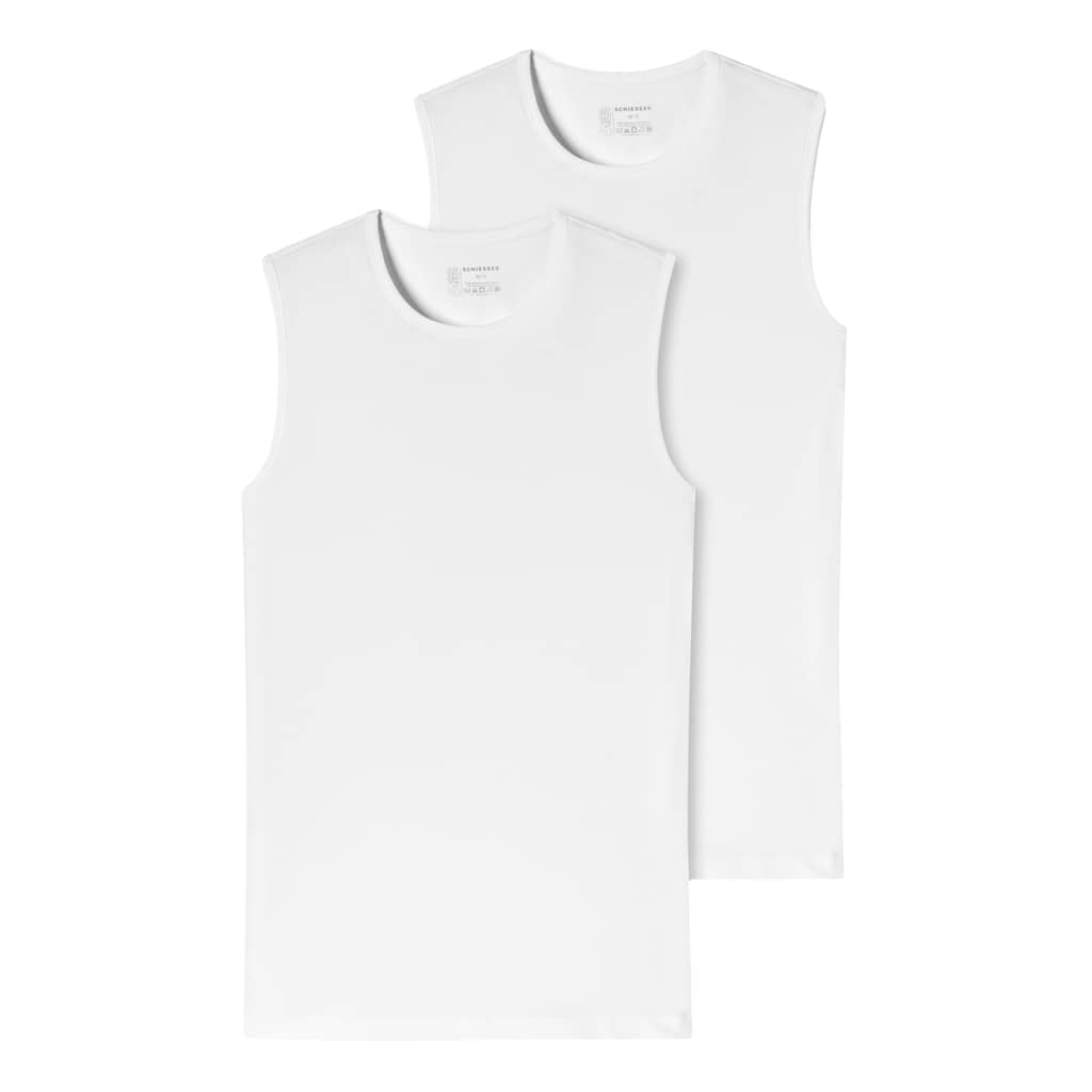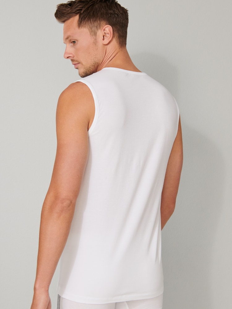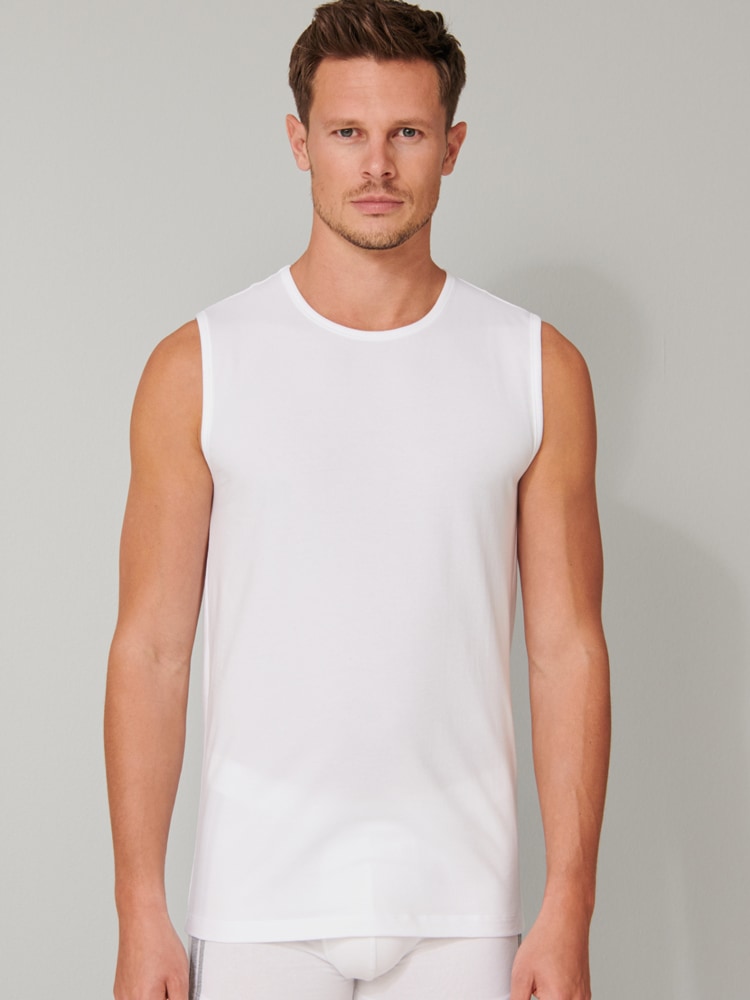 2 tanktops til mænd i en dobbeltpakke fra den populære SCHIESSER "95/5"-serie. Tanktoppen har en rund hals og er lavet af 95% naturlig økologisk bomuld og 5% elastan. De er strikket i en perfekt pasform i elastisk single jersey kvalitet. 95/5 tanktops kan vaskes ved en temperatur på op til 60 grader.